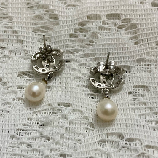 Vintage Chanel 925- Sterling -Pearl Dangling Earrings 1in x 1/2in
