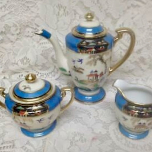 1908 Antique Noritake Japan. Polychrome Blue Willow, 13pc Demitasse Tea Set