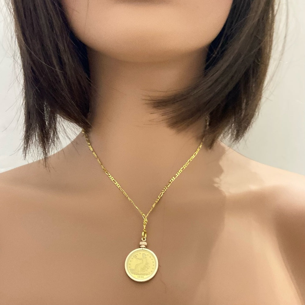 This is a beautiful gold plated coin pendant, a copy of the old antique gold coin. Take note “copy” is printed on the reverse side. It comes with an added coin bezel and 18-inch gold plated figaro chain upcycled into a wearable, elegant necklace. It is about 3/4 inch in diameter or 21 mm or about the size of a nickel. It is in very good condition as shown in photos. Please supersize photos for condition details.