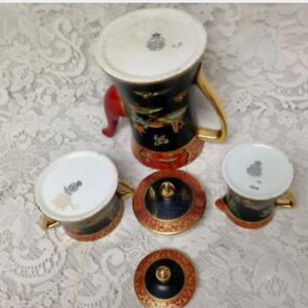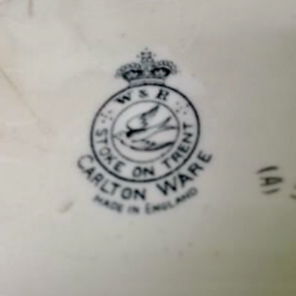 It is marked: Carlton Ware. The lid of the teapot had been glued together and the teapot has crazing and staining. The cups has inner gilding and it has wear or discoloration Overall, the set is in good vintage condition as shown in photos. Package weight is about 6 pounds. Market or replacement value of this set is unknown due to its rarity. It is marked: W.R., Stoke on Trent, Carlton Ware, Made in England. The symbol was used during the period 1894-1927.