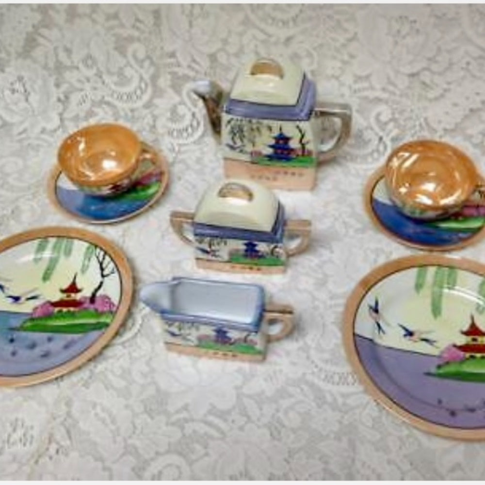 1920-30s, Lusterware, Japan, Variant Gaudy Blue Willow 11pc Tea Set