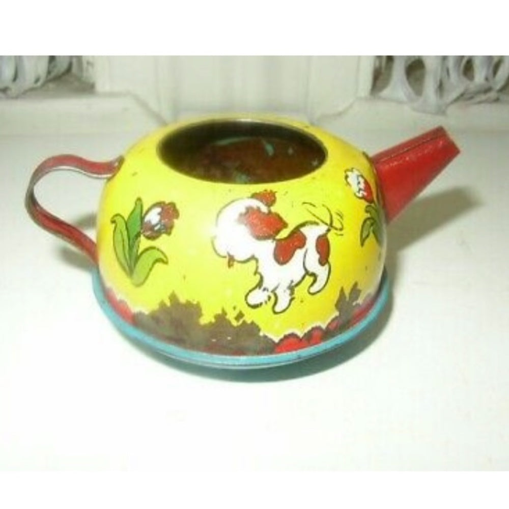 This is a beautiful 14-pc children’s Tea Set made by Ohio Art in 1956, titled: Boy and Girl in a Garden. It is lithograph decorated depicting a girl planting with her dog watching and a butterfly hovering around. Dimensions of these pieces are summarized as follows: