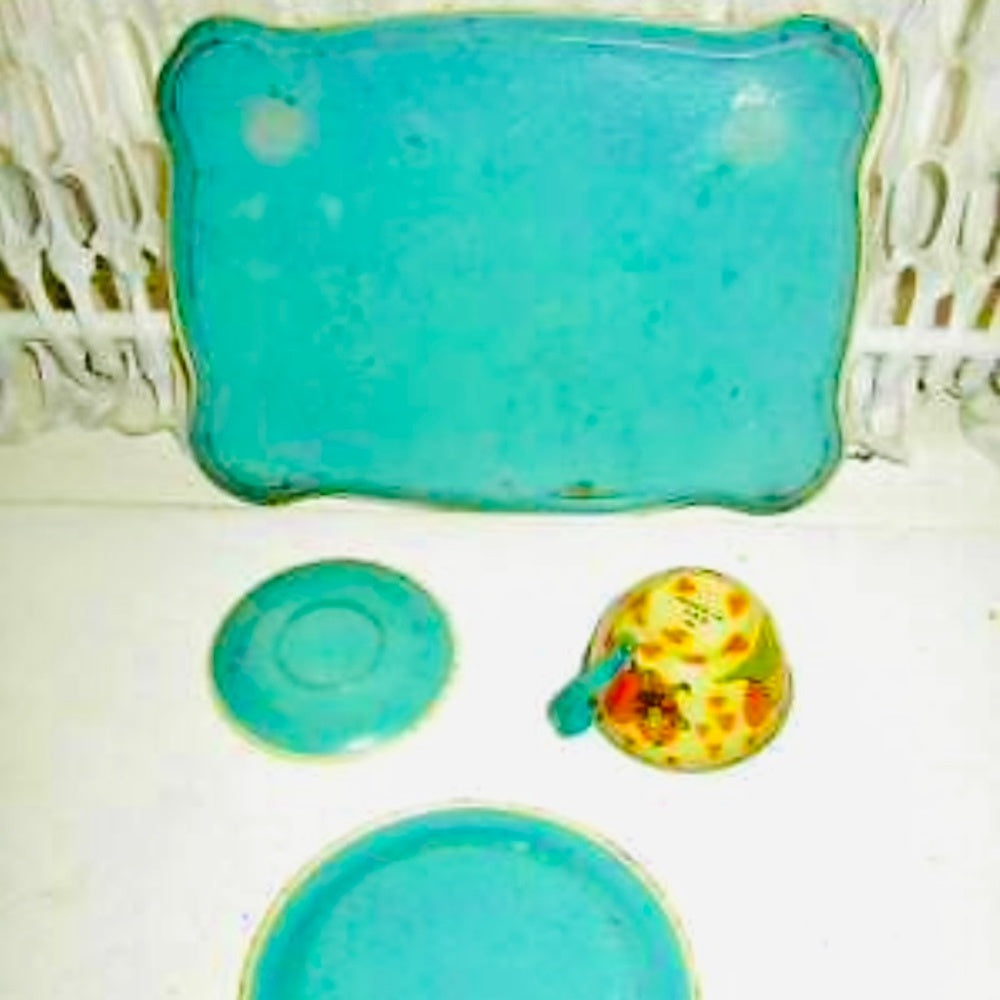 This is a beautiful vintage 4-pc child’s Tin Tea Set which includes the following: