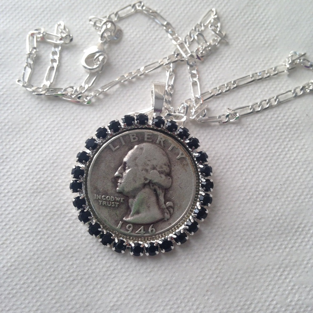 This is an authentic .900 Silver Quarter Dollar pendant necklace with 16-inch silver chain. The silver quarter dollar coin is about 3/4 inch in diameter or about 1 inch in diameter including the silver tone frame with rhinestones. Other silver quarter dollar coin and chains available are shown in the last 3 photos. If you prefer other dates please contact me for availability.