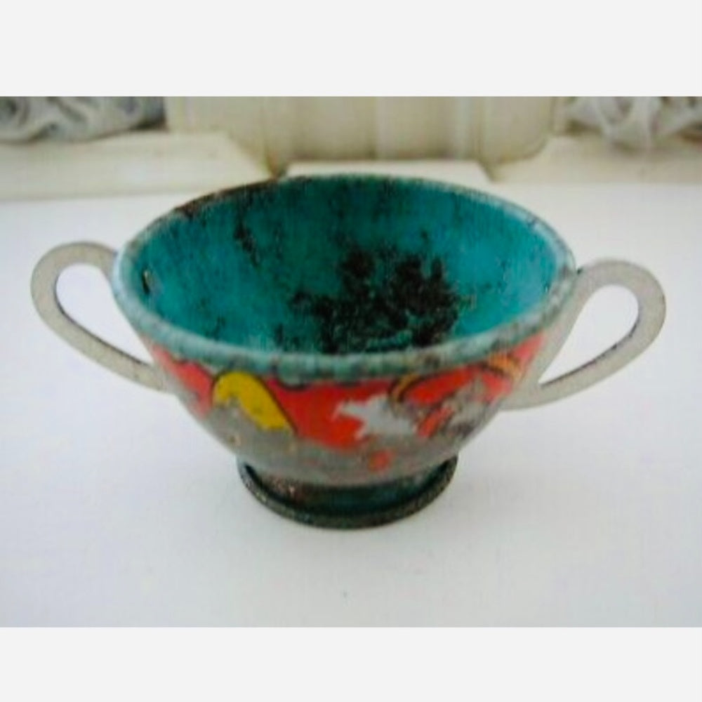 This set is in good played with condition, with normal age wear, such as paint loss, surface rusts,etc as shown in photos. All cups are marked: Ohio Art Co., Bryan, O. USA, no. 158. The Housekeeping Toys Collectors Guide shows this set on page 185 and a 21-pc set is worth $225.00. This is a collectors item and not intended to be used or played with.. Please supersize photos for condition details.