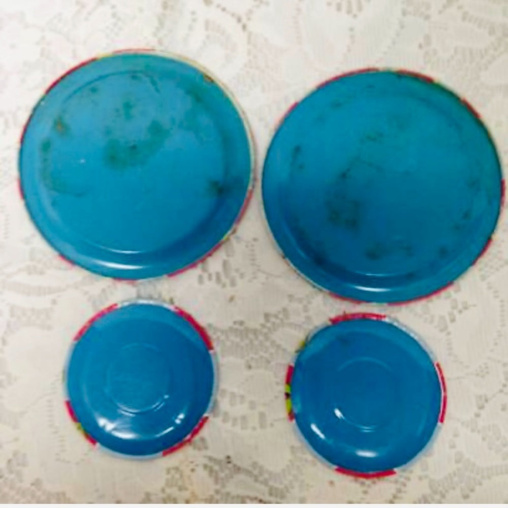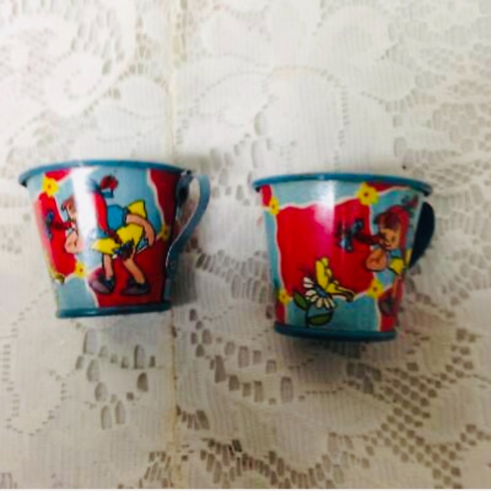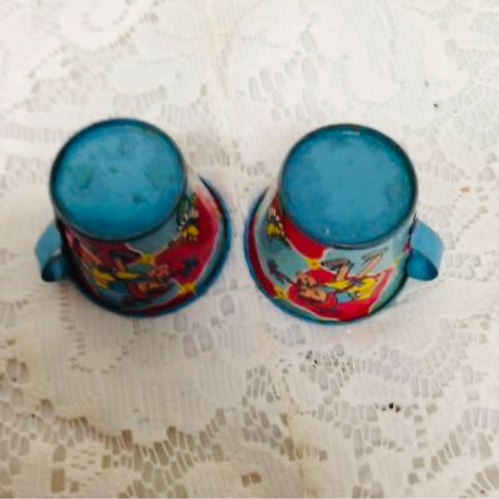 This set is good condition with usual age wear, such as or surface rust, paint loss, scratches, dents etc. as shown in photos. All cups are marked: Ohio Art Co., Bryan, O. USA. The Ohio Art Collectors Guide shows this set on page 106 and a 11-pc set is worth $160.00.