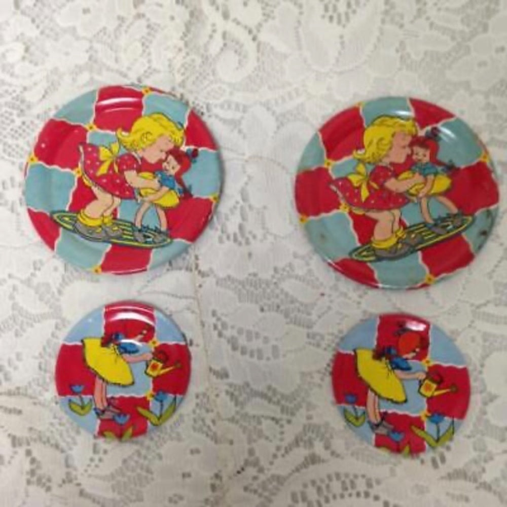1950 Ohio Art, Girl with Dolly, 7-pc Child’s Tin Tea Set