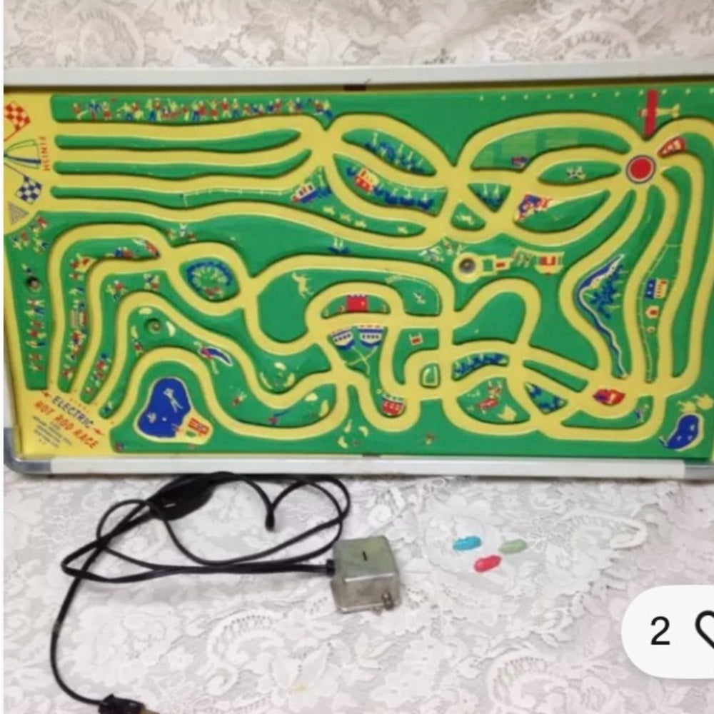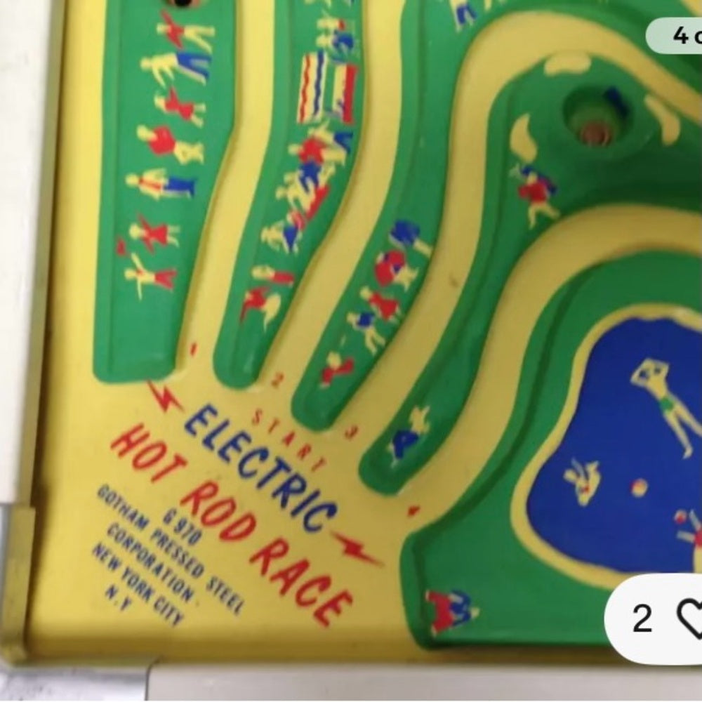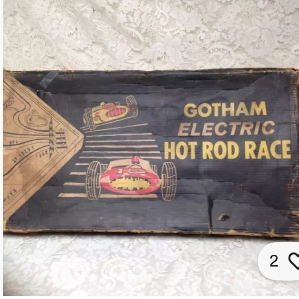This is a wonderful pressed steel electric hot rod race toy. The box measures 29 inches long, 16 inches wide and 4 inches deep. The box is with normal wear, tear and staining however, the contents are in better condition as shown in photos. It comes with a pressed steel race course, 3 tiny cars, electrical plug, etc. It wasnt tested, selling as is. It is marked: Gotham Pressed Steel Corp., New York, NY; Made in USA; ESt.1917; It has a shipping label marked: 12/10/1952. Package weight is about 8 pounds.