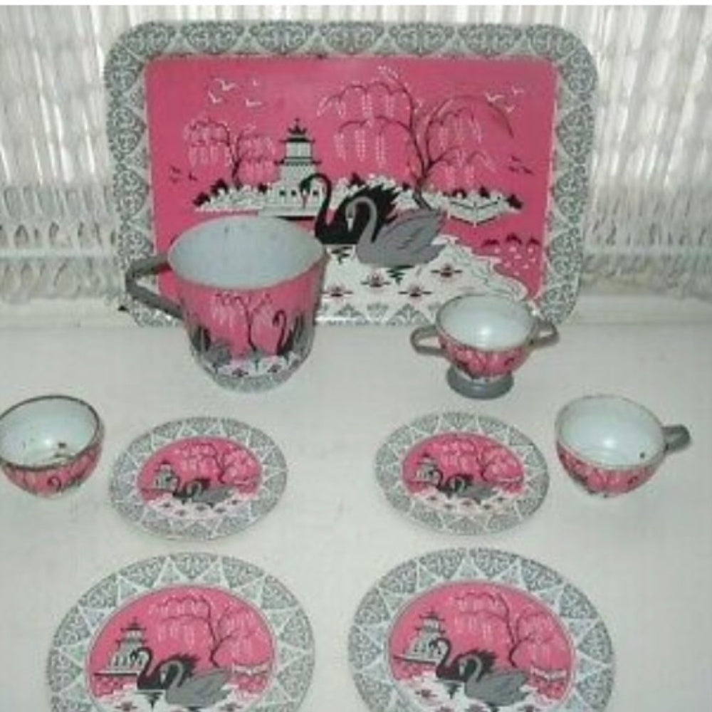 1956 Ohio Art, Pink Willow with Swans Child’s Tin Tea Set
