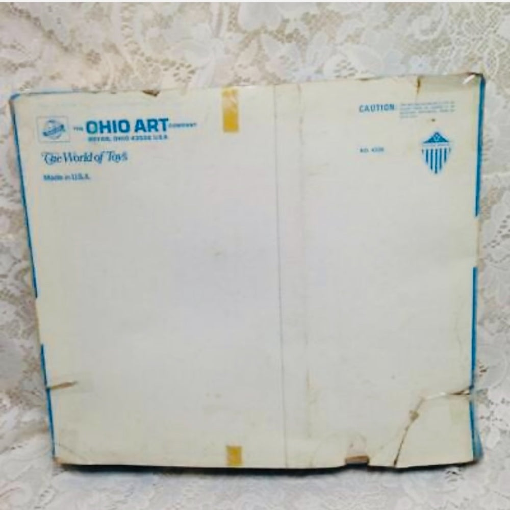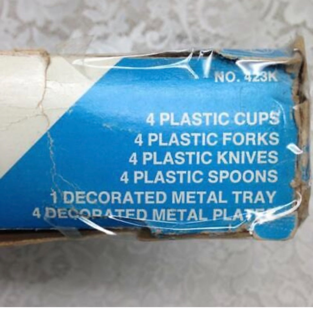 This set is in good condition, still in its original packaging but the box is torn and damaged shown in photos. The tray is marked: Ohio Art, Bryan, Ohio. All pieces are made of tin except for the cups and flatware which are made of plastic..