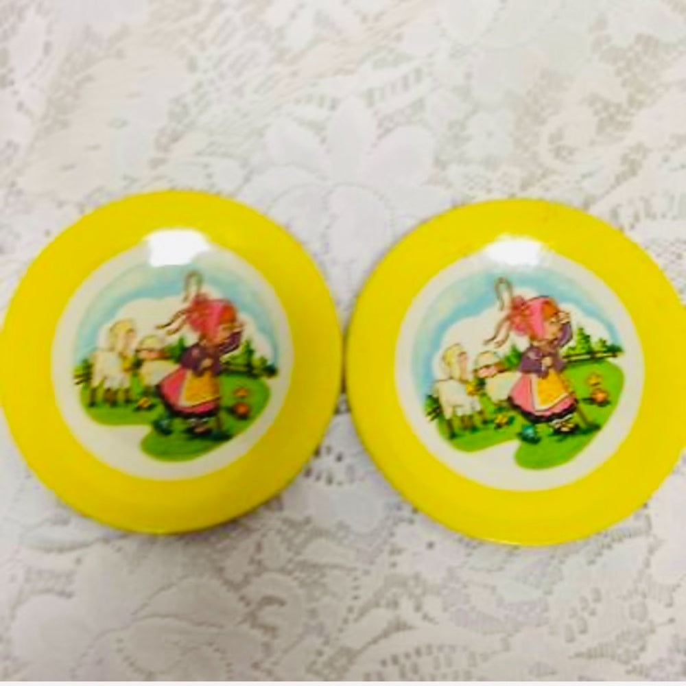 This is a rare, beautifully lithographed 10-pc child’s Tin Dishes-Dinner Set, depicting Bo Peep in a colorful yellow background. The set includes the following: