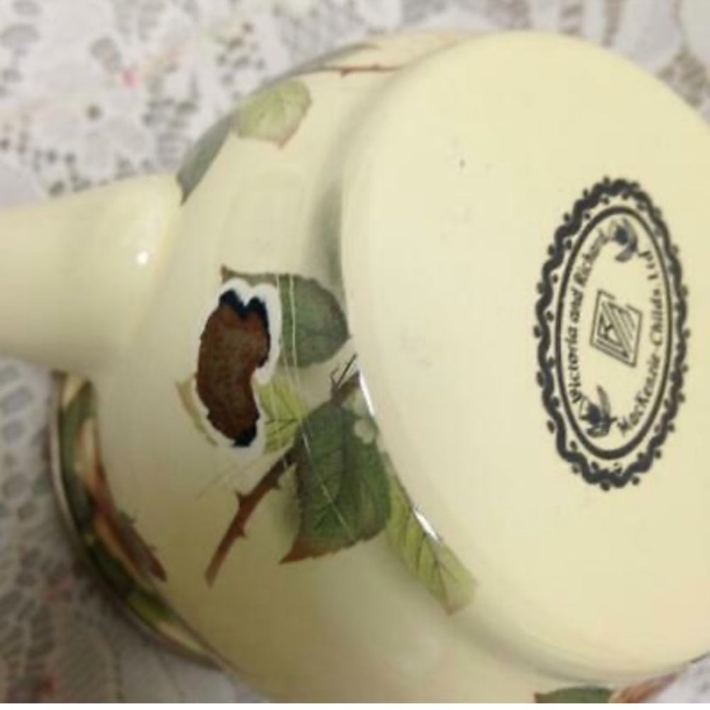 The Creamer has a dent but the rest of the set is in very good condition as shown in photos. It is marked: 1983 Mackenzie Childs Ltd.; Victoria and Richard. Package weight is about 8 pounds. .