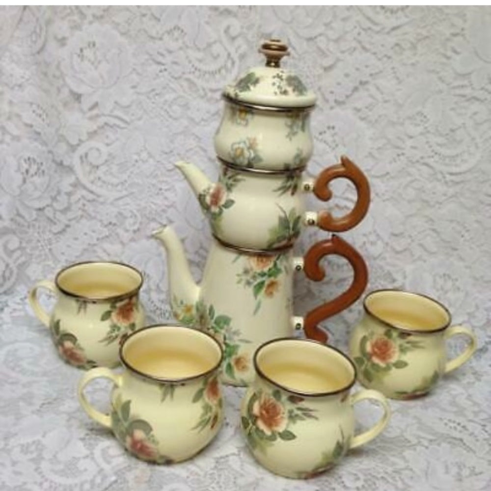 This is a beautiful, very good quality, 8-piece Tea or Camp Set, made of yellowish beige enamelware with floral design. The set includes the following:
