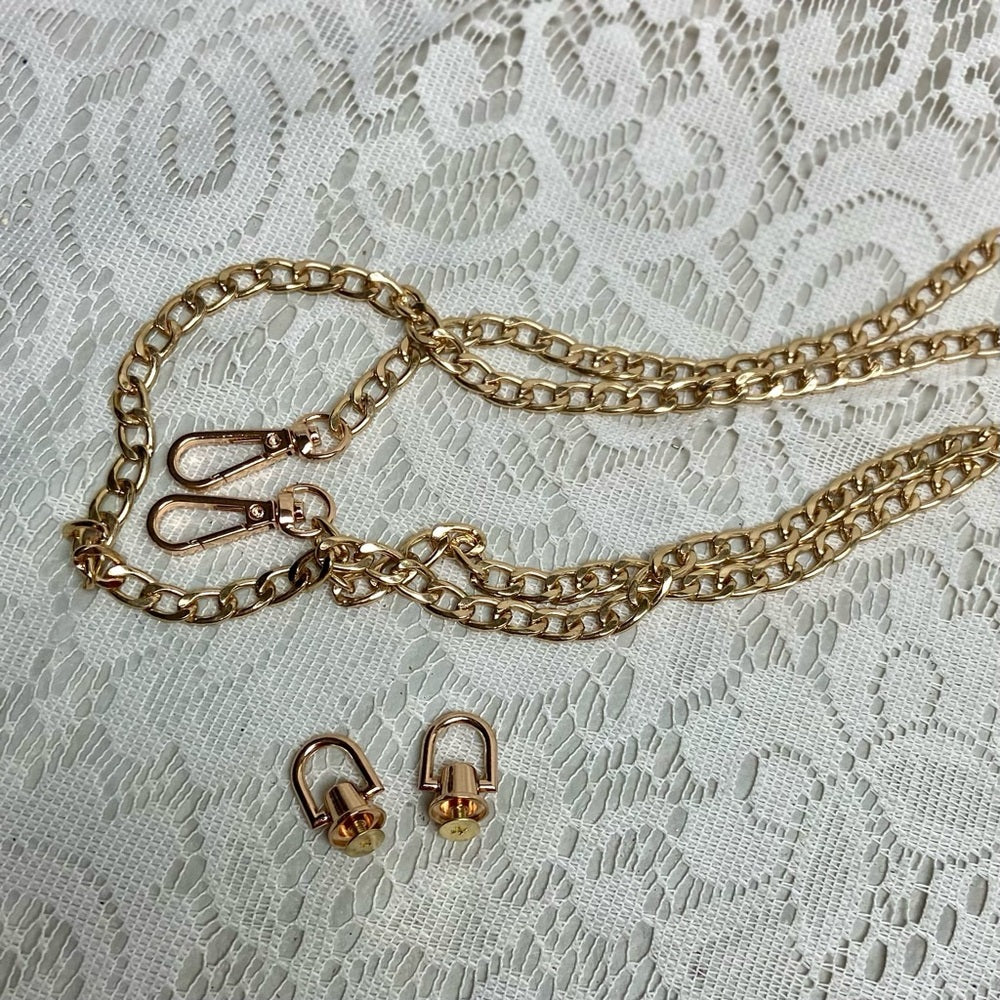 This is a 3-pc kit consisting of one gold chain strap of about 48 inches and 2 metal hook rivets to be attached to both side of your purse or wallet. It is in very good condition as shown in photos.
