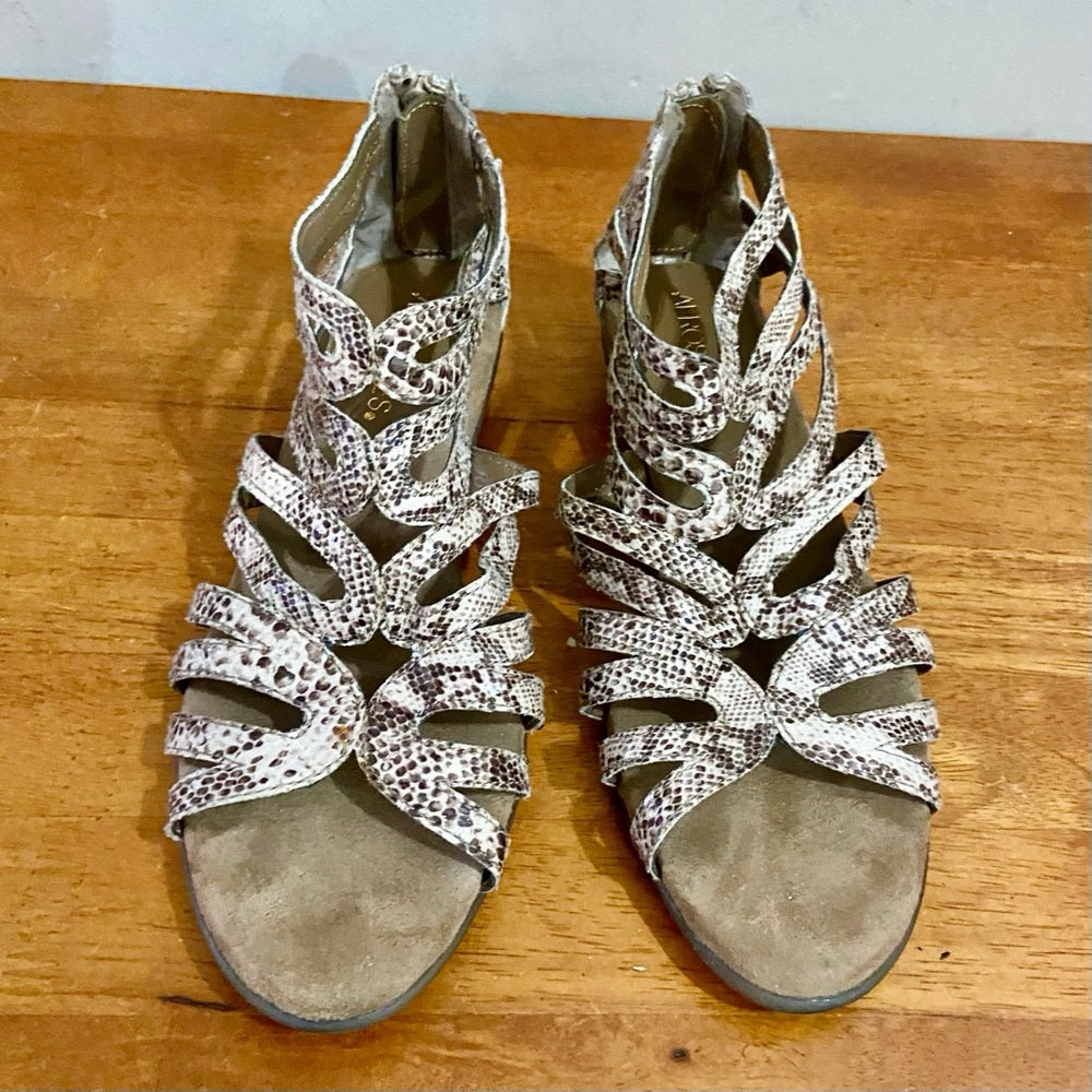 This is a beautiful pre owned pair of brown reptile Strappy shoes Size 8.5. It measures 9.5 inches long and 3.5 inches wide and 1 inch heels. It is in good condition with minimal wear as sh in photos.