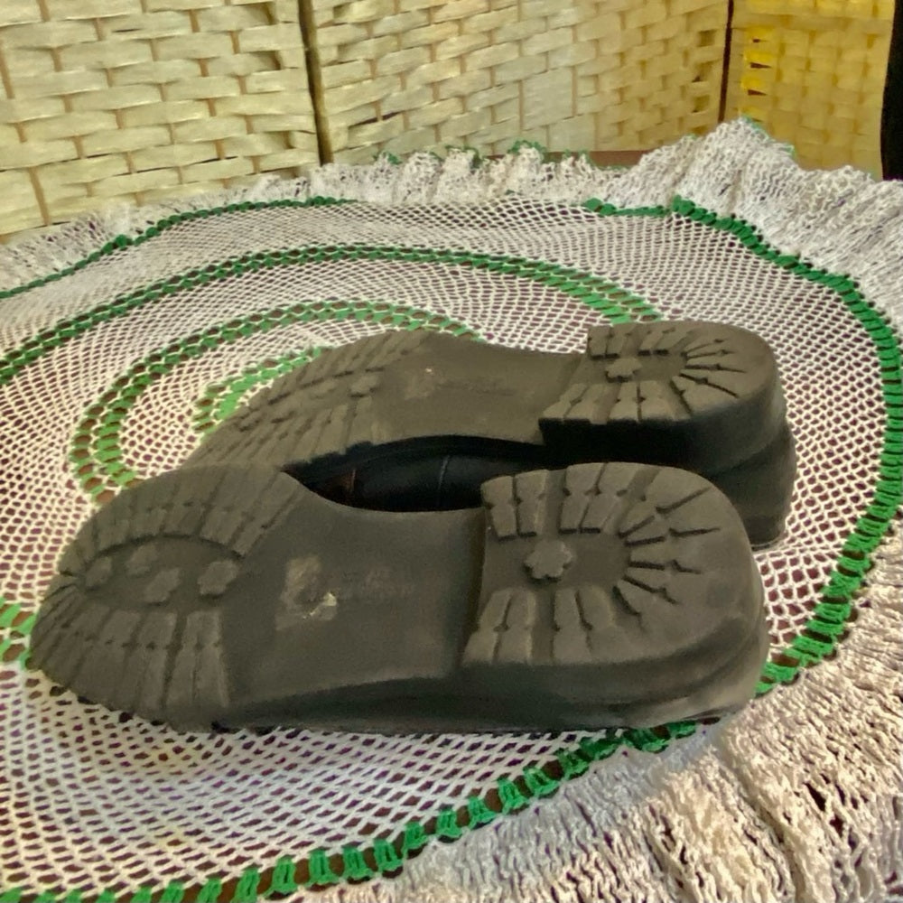 This is a beautiful pre owned pair of shoes made of black leather with brown trim. Size 8.5. It measures 10.5 inches long, 3.5 inches wide, and 1 inch high. It is in good condition with some wear on the brown trim as shown in photos.