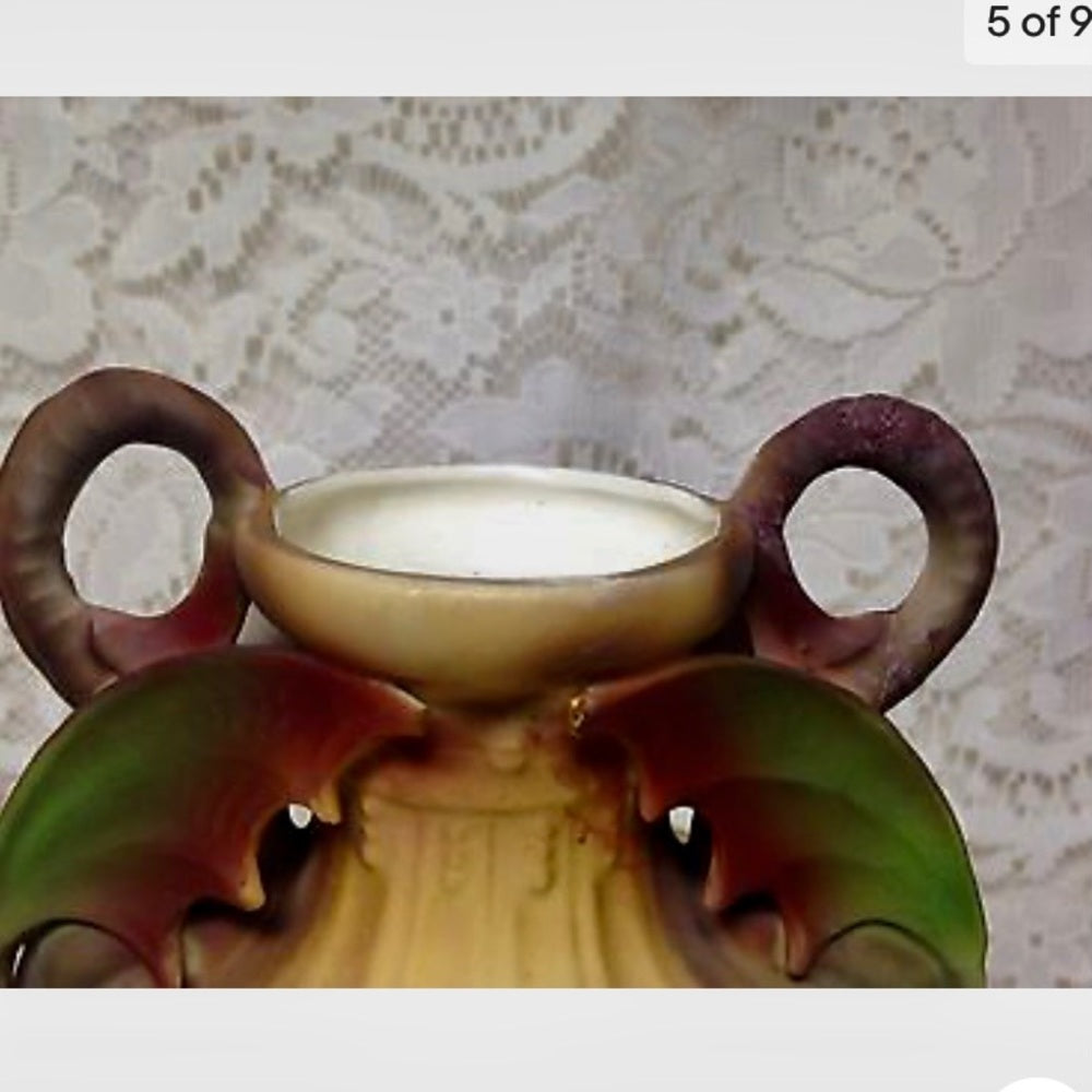 This is a very rare and elegant vase with a very beautiful hand painted portrait of a beautiful lady, maybe an Austrian Princess. The vase is uniquely designed with wings on both side, similar to that of a dragon or bat. It measures 10 inches high and 5.5 inches wide. It is in good condition with repaired tiny chips on the tip of both of the back wings and another repaired tiny chip at the tip of the right front wing. Likewise, it shows at the back that the left broken handle has been repaired. It is marked at the bottom in red print: a Crown logo and under it: RH, Royal, Rex Tima. Or it could be Wex or Wat Tima. Made in Austria. Possibly, this is made of a whiteware material popularly used during the last quarter of the 19th century to early 20th century.