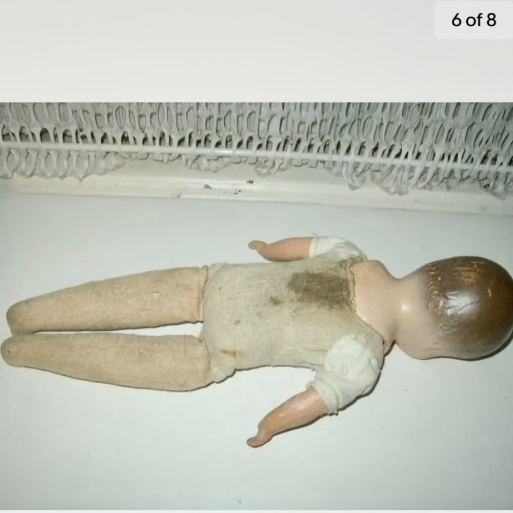 This is a beautiful 18-inch doll made of composition head and arms, cloth legs and body. She is wearing knitted bonnet, pearl necklace, red dress complete with chemise, pantaloons and pair of buttoned shoes. She had a face lift but the paint job wasn’t done well especially her eyes needs a make-over. Overall, she is found to be in good condition with normal age wear as shown in photos. She is marked: Reliable.