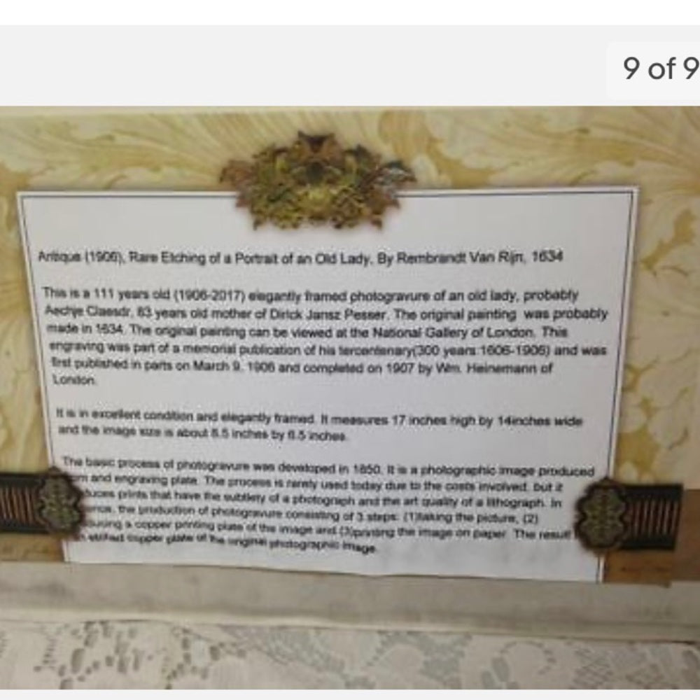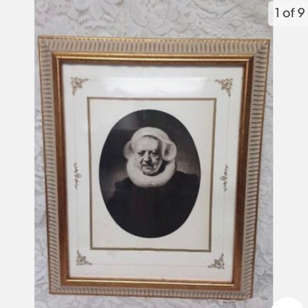 This is a 117years old (1906-2023) elegantly framed photogravure of an old lady, probably Aechje Claesdr, 83 years old mother of Dirick Jansz Pesser. The original painting was probably made in 1634. The original painting can be viewed at the National Gallery of London. This engraving was part of a memorial publication of his tercentenary(300 years:1606-1906) and was first published in parts on March 9, 1906 and completed on 1907 by Wm. Heinemann of London.