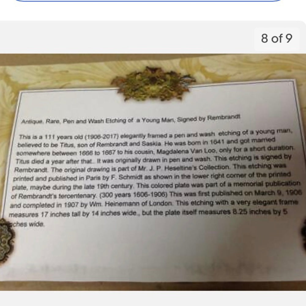 This is a 117 years old (1906-2023) elegantly framed photogravure of a young man named Titus. The original painting can be viewed at the National Gallery of London. This engraving was part of a memorial publication of his tercentenary(300 years:1606-1906) and was first published in parts on March 9, 1906 and completed on 1907 by Wm. Heinemann of London.
