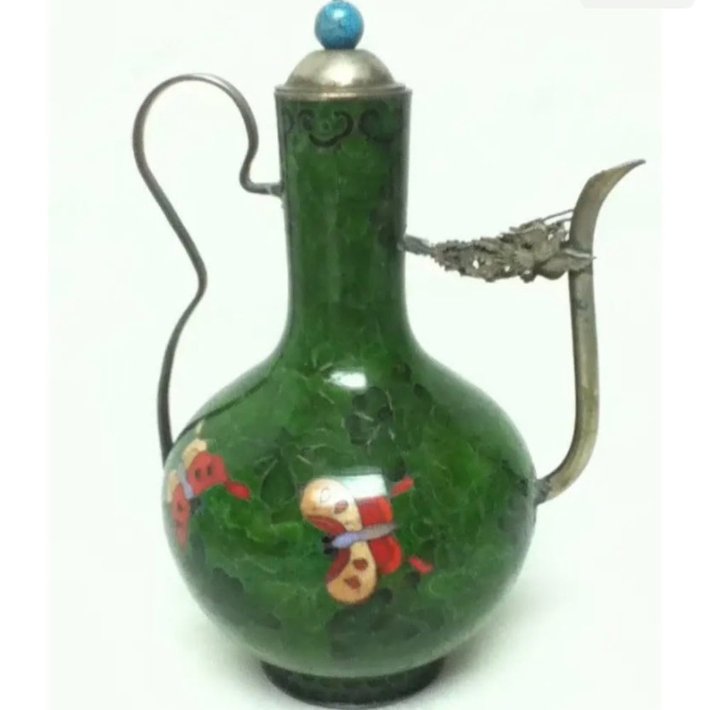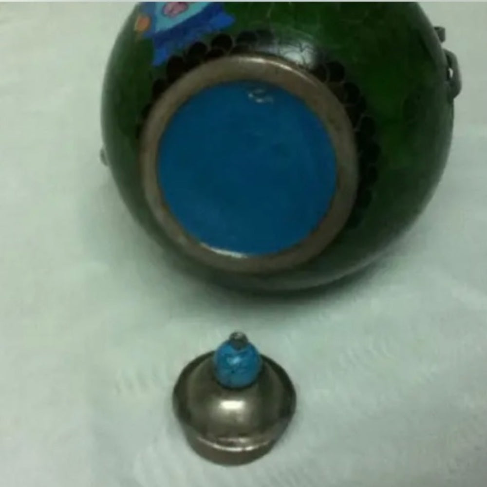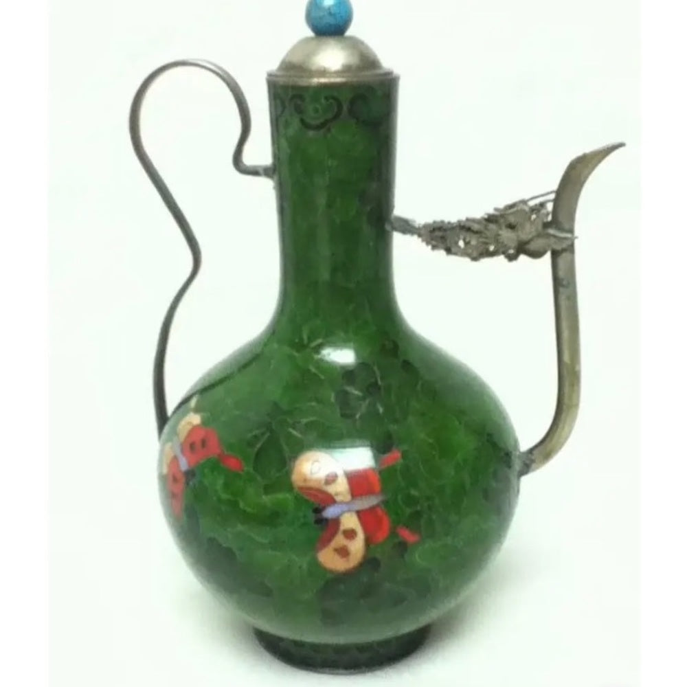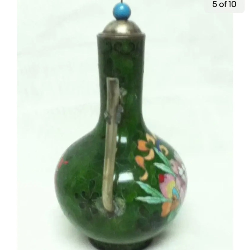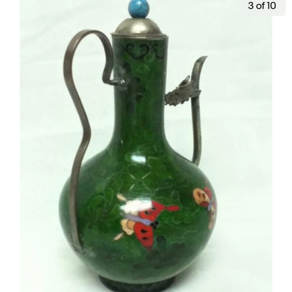 This is a beautiful teapot made of cloissone with pewter lid, spout and handle. It has floral decoration depicting a carnation in colors of pink, orange, yellow, green, purple, etc.. over a green background. It measures about 7 inches high and about 5 inches in diameter. It is in good condition with minimal wear or damage on metal joints of spout and handle as shown in photos. No makers mark found.