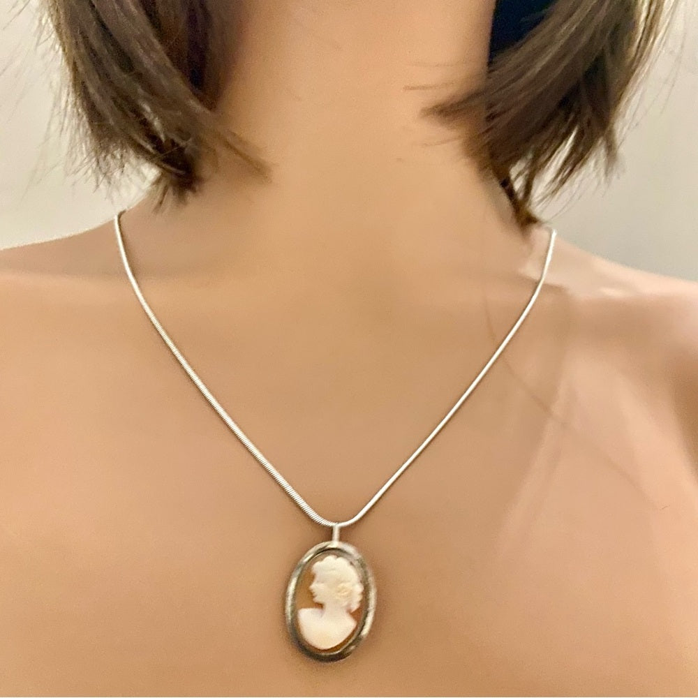 This is a beautiful , genuine Shell cameo brooch and sterling pendant necklace. This beautiful cameo measures 1 inch long and 3/4 inch wide and it comes with a 24-inch 925 snake chain. It is in good vintage condition as shown in photos.