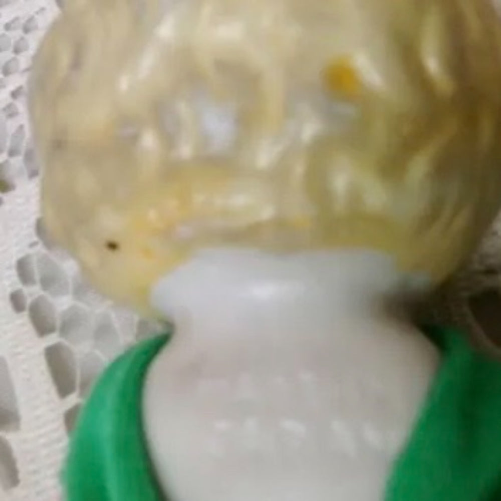 This is a beautiful 5.25-inch doll, made of bisque with jointed arms, painted face, big googly eyes, molded, blond hair and she is wearing a green dress. One of the feet has a chip but overall she is in good vintage condition with minimal wear or discoloration as shown in photos. Her back is marked: Made in Japan.