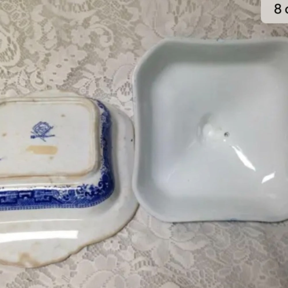 This is a beautiful and rare covered bowl or soup tureen and decorated with the popular blue willow pattern. It measures about 6.5 inches tall with lid,10.5 inches wide from handle to handle or about 8 inches in diameter. It has 2 repaired chips on its lid, some staining and crazing as shown in photos. It is marked: Ridgway & Co., England; Engraved 1832, Semi China. Package weight is about 4 lbs.