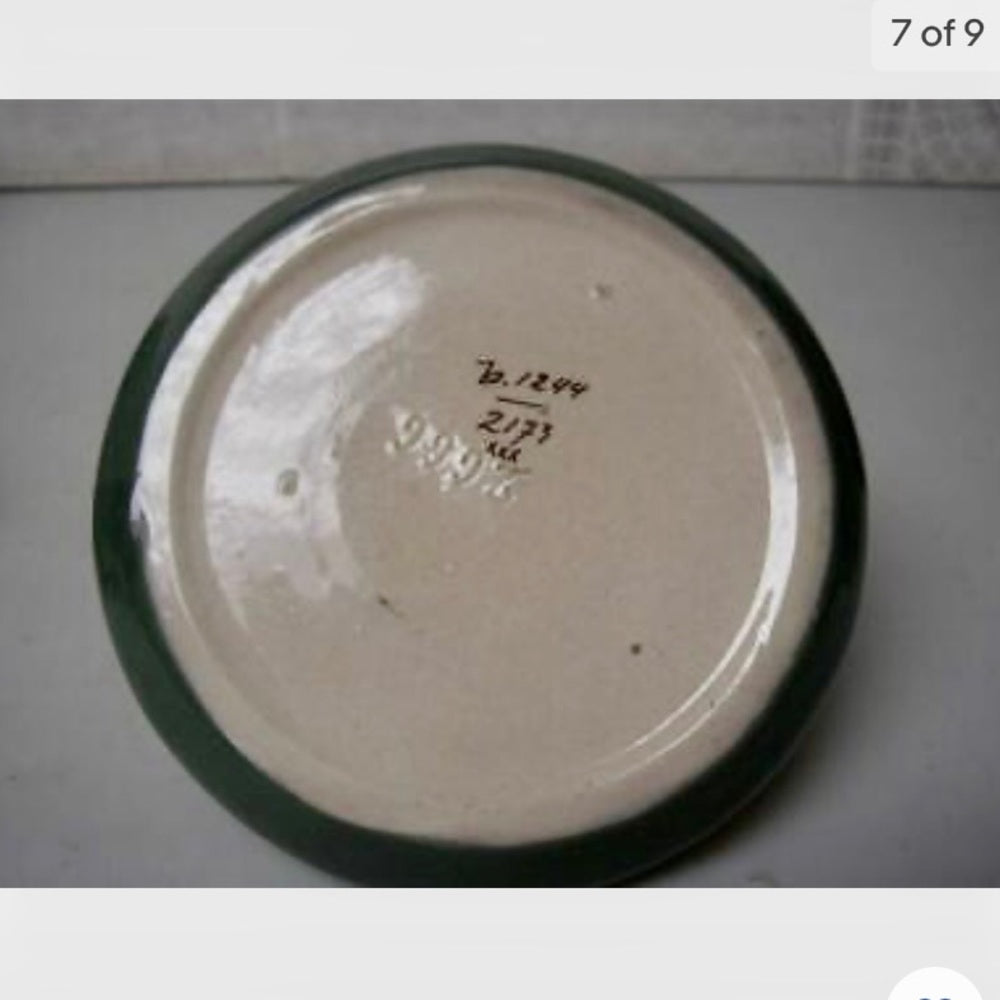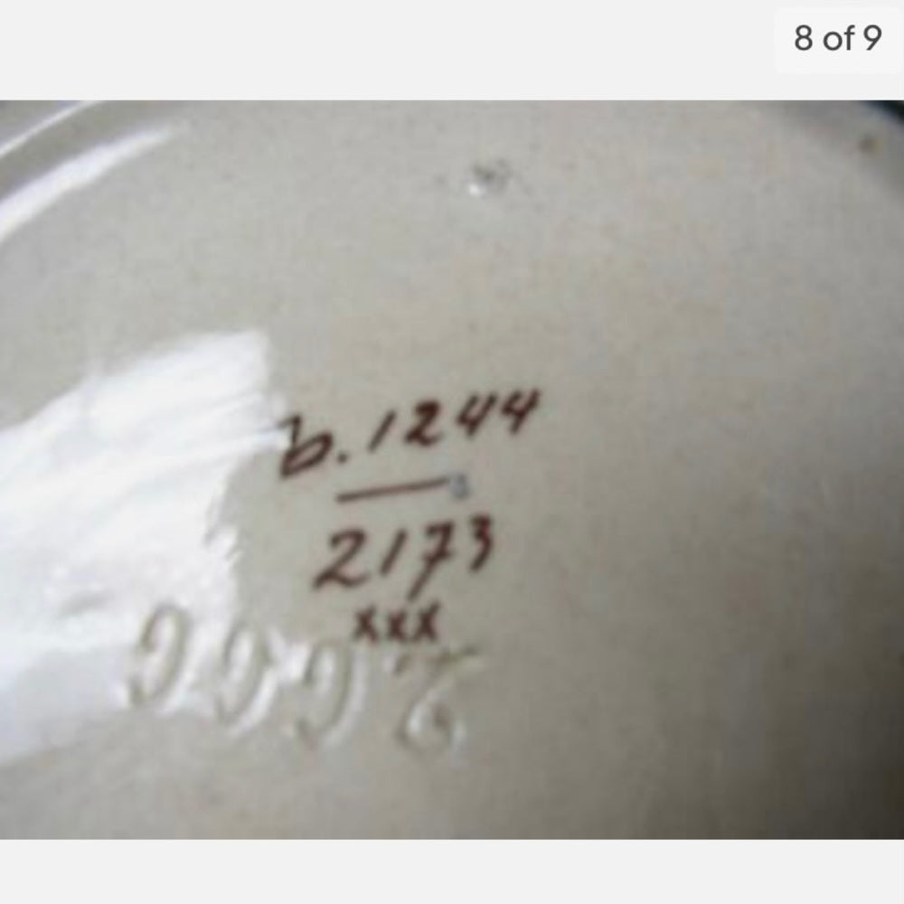 This is a beautiful 2 handled art pottery of an unknown usage with silhouette decoration of a gentleman that resembles Pres. Washinton. I guess, it can be used asa candle holder, a flower vase or as a desk accessory. It measures 3.5 inches high and 5.25 inches in diameter. It is in very good condition as shown in photos. It is marked with several numbers such as: b 1244/ 2173 xxx 2666. Packaged weight is about 2 pounds. Sorry, for the glaring white spots caused by my ceiling lights.