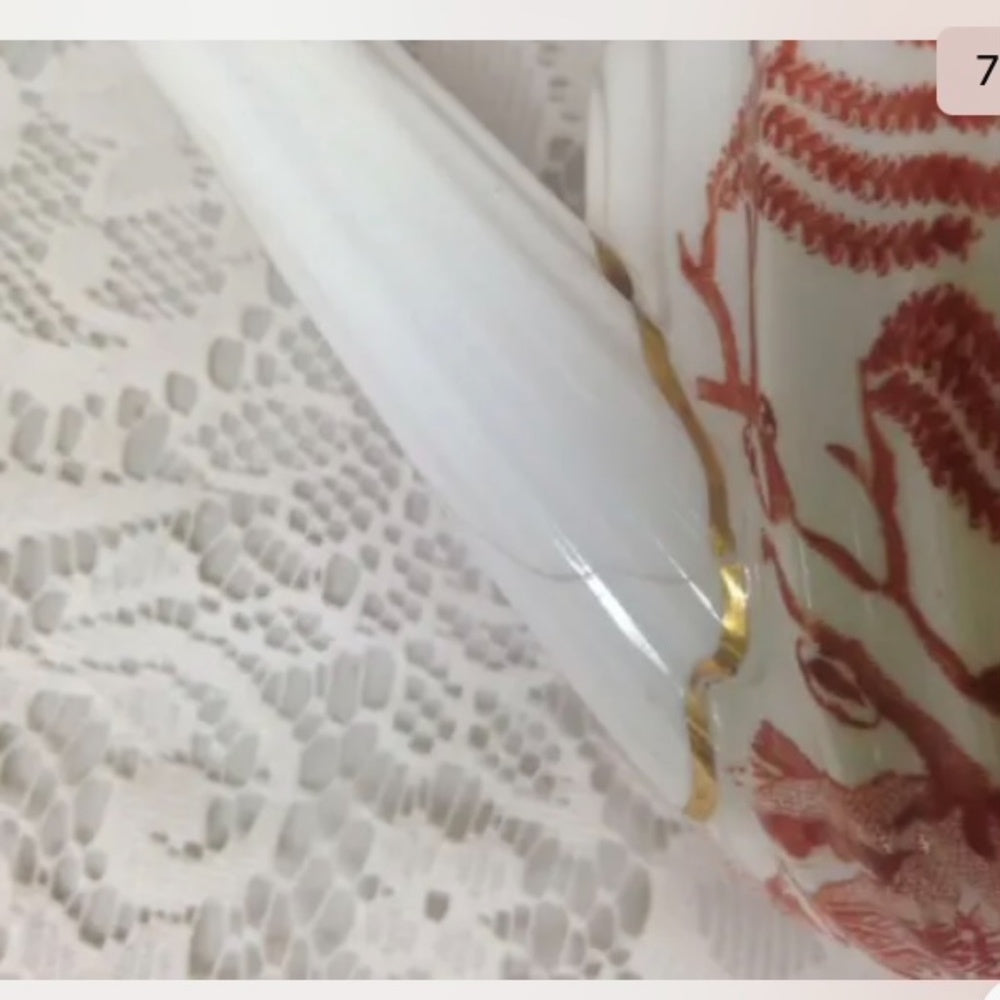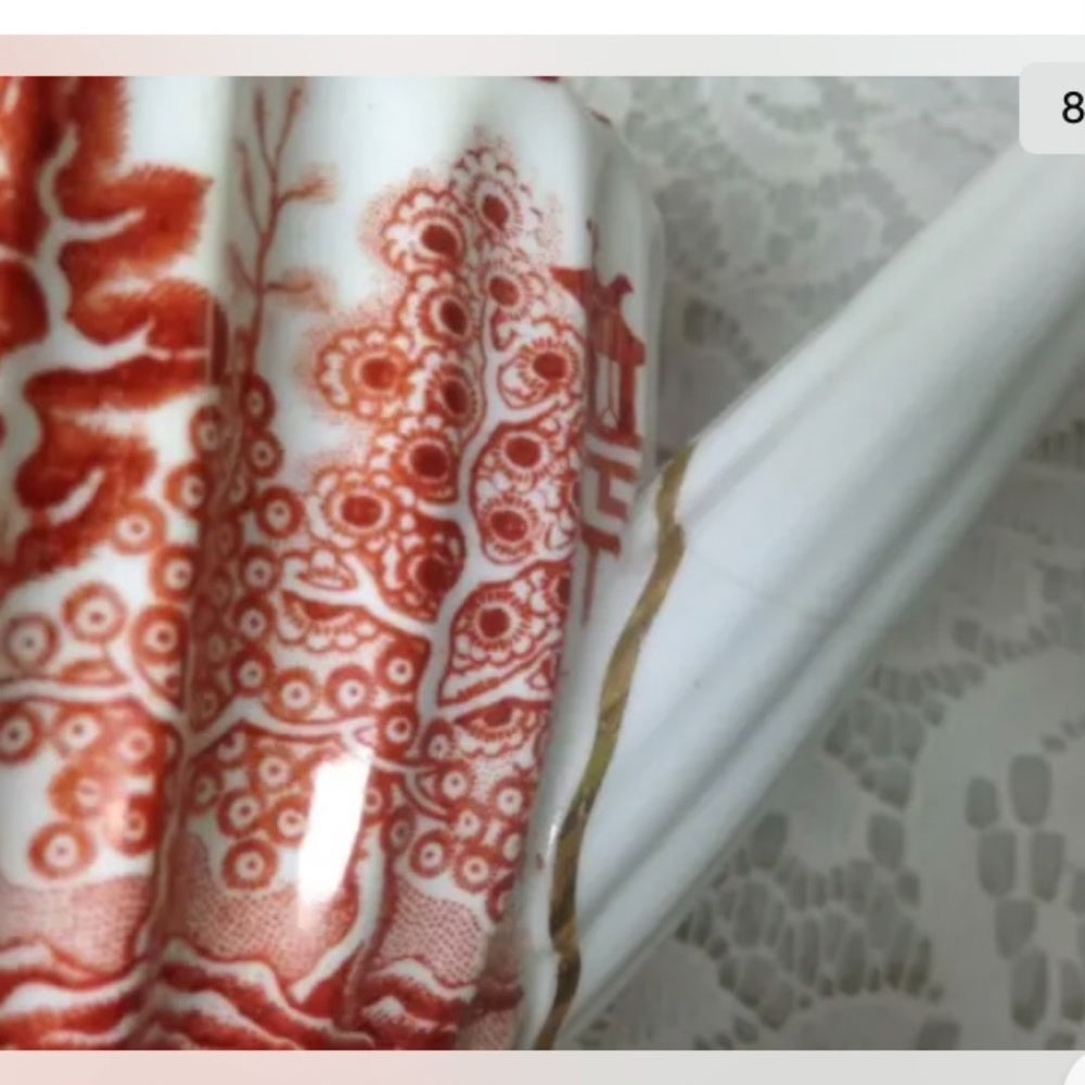 This is a rare, 2pc Teapot with lid set decorated with the popular blue willow pattern but in orange red and white color. It measures 5 inches high and 8.5 inches wide.