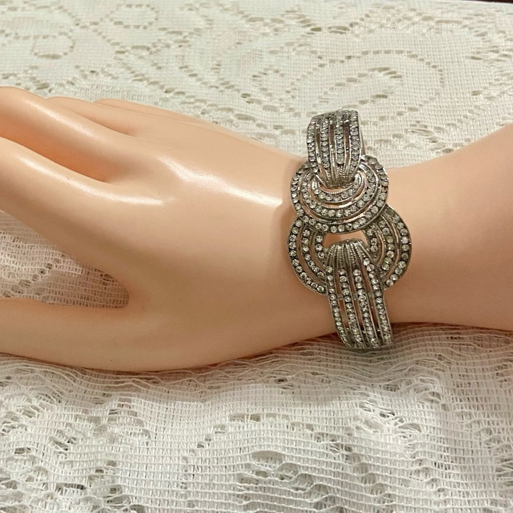 This is a beautiful, vintage, chunky silver tone hinged bracelet decorated with clear crystals. It is very good condition with minimal wear as shown in photos. It measures about 8 inches in circumference and 1.25 inch wide. Please super size photos for condition details.