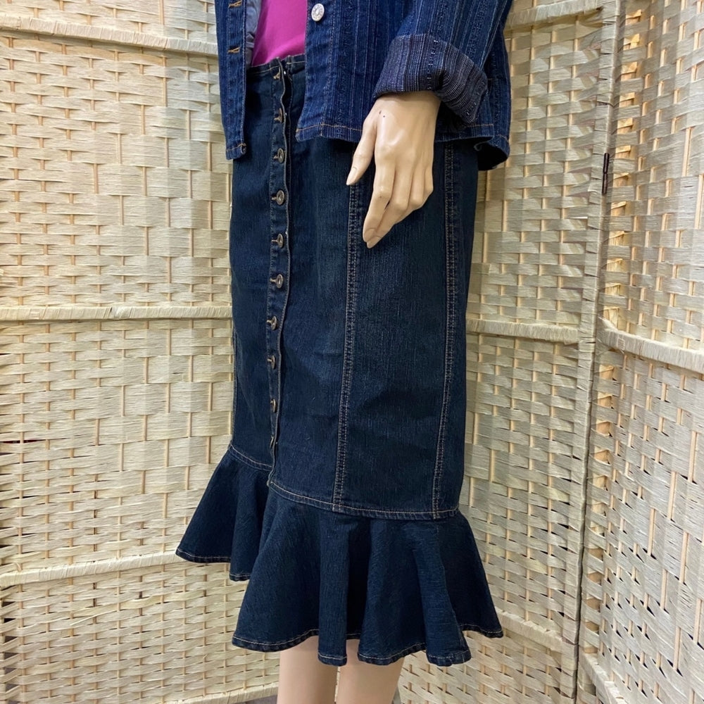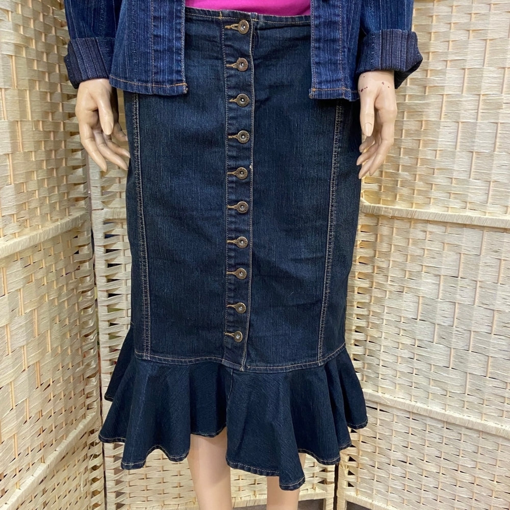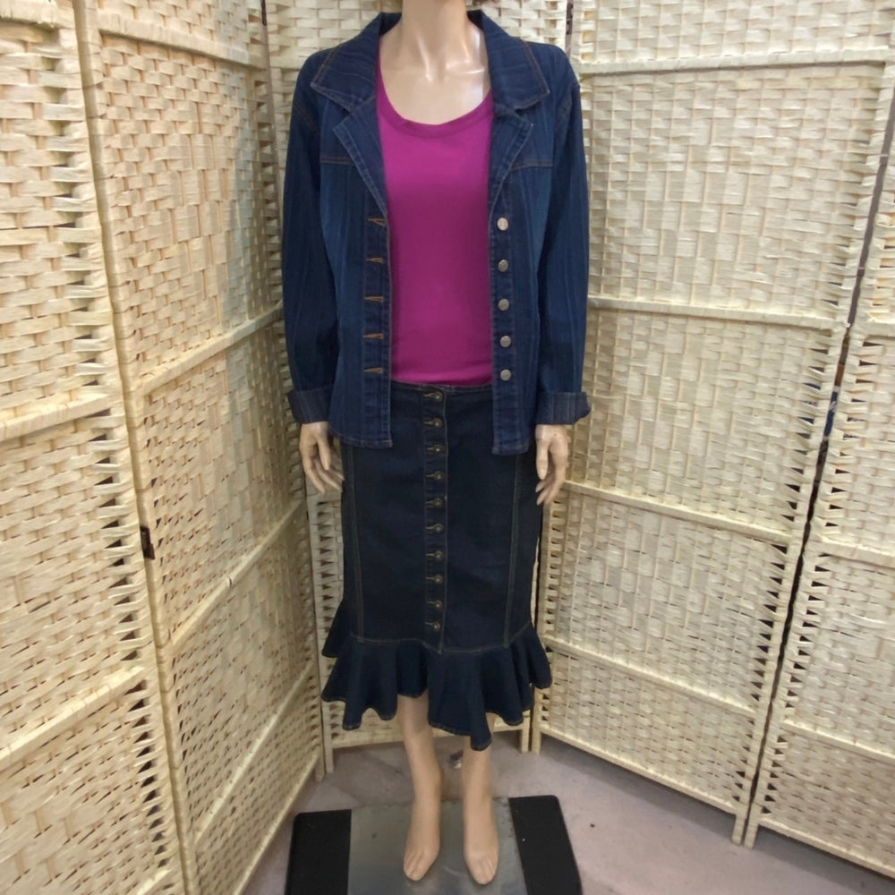 This is a beautiful pleated button down denim skirt from Ashley Stewart. It is in good condition with minimal wear as shown in the pictures above. This will fit size: 14, actual measurements to follow:
