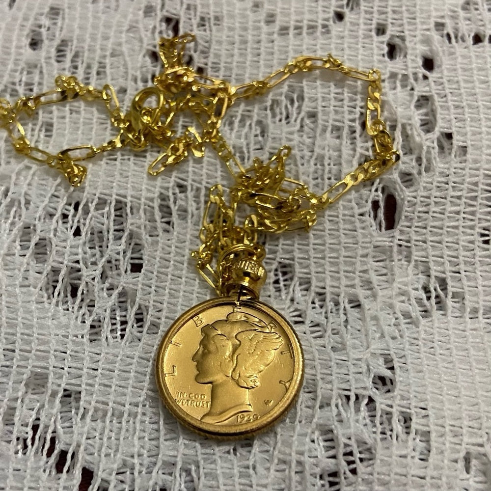 Authentic 1929 Silver Mercury Dime, Gold Plated with 18-inch Gold Fille…