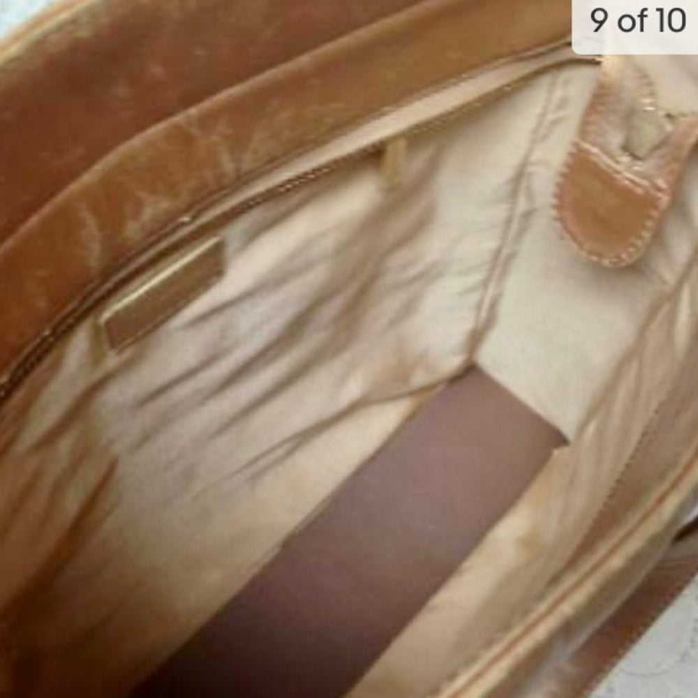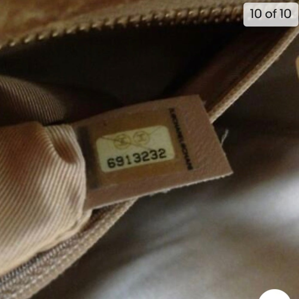 This is a beautiful handbag made of lambskin leather in choco bar design in elegant gold color. It measures 11.5 inches high, 11 inches long and 3 inches wide and comes with a 9-inch drop handle. The sides have issues or shape irregularity, stitch issues, corners have scuffs or wear and there are surface scratches, discoloration and soiling as shown in photos. It has a CHANEL label and serial no. 6913232 on the interior. Please supersize photos for condition details.