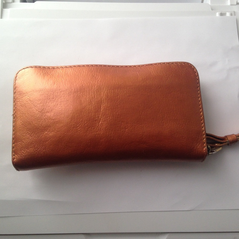 This is a beautiful , pre-owned zip-around long wallet made metallic copper leather. This wallet has a slots for bills, IDs and Credit cards. Folded it measures about 7 inches long and 4 inches wide. It is in good condition with minimal wear and soiling of inner coin pocket as shown in photos.