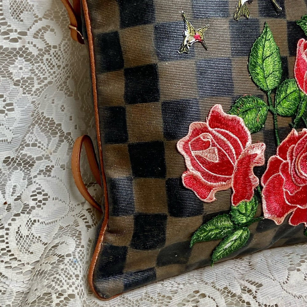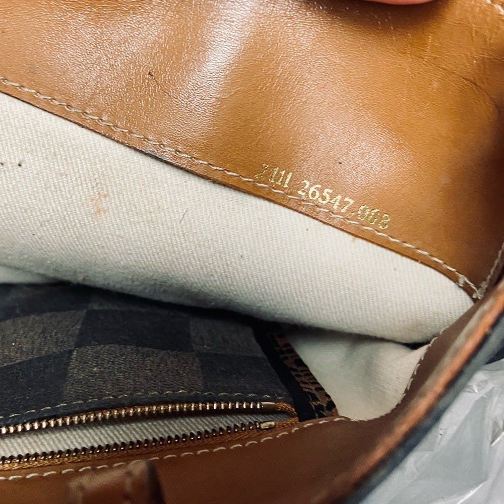 This is a pre-owned Fendi Handbag made of black and tan checkered pic canvas with tan leather trim and handle. It measures 13 inches long and13 inches wide. It comes with a 12-inch handle or strap. A crossbody faux leather strap is added to the this tote but it is not original. It has issues on the exterior and it was repainted and decorated with floral embellishment. Overall, it is in good condition with minimal wear as shown in photos. Please supersize photos for condition details.