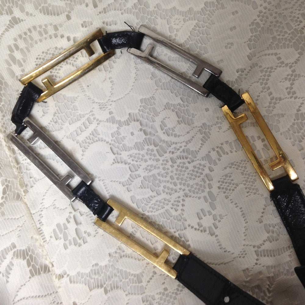 This is a pre-owned rare Fendi, metal mono hip fabric fanny belt bag. It measures about 32 to 34 inches long. The belt has 5 heavy, metal F mono and each one measures about 3 inches long and 1 inch wide. The fanny or hip fabric belt bag measures about 9 inhces long, 7 inches wide and 5 inches thick. It has wear or discoloration and fading on metal mono hip belt however the fabric bag is in good condition as shown in photos.