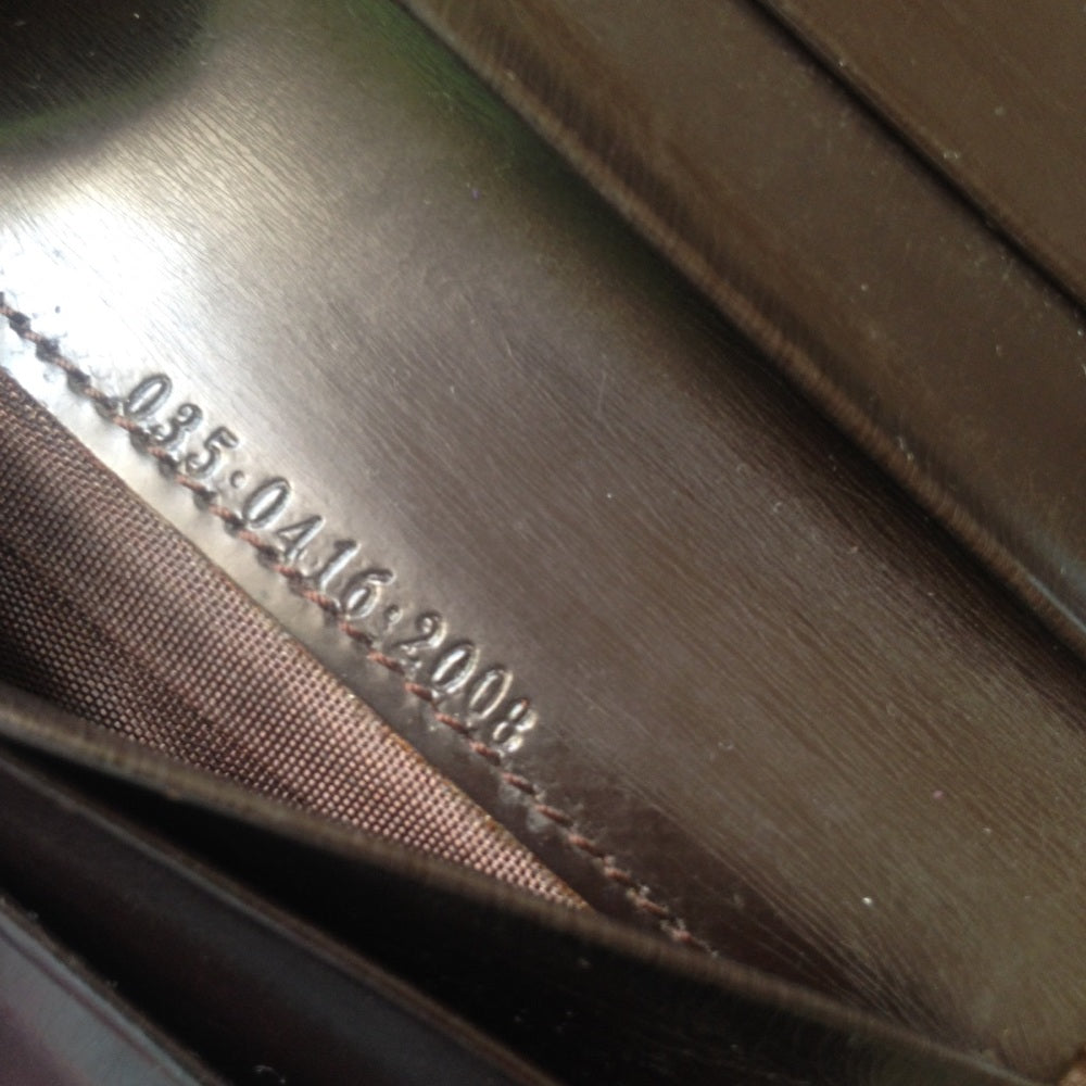 This is a beautiful Pre-owned tri-fold wallet made dark brown enamel with leather. Interior. It has pocket for coins, keys, slots for bills, IDs, Credit cards, business cards, etc.This wallet is in good condition with minimal edge wear on folded area, soiling or discoloration as shown in photos. It is marked: Gucci, Made in Italy with SN shown in last photo as 035-0416-2008.