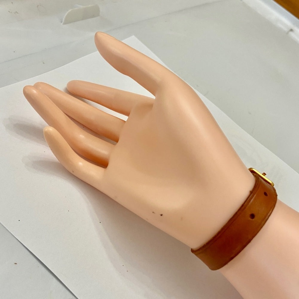 This is a from an authentic Louis Vuitton tan leather name tag from a handbag or luggage. It measures 3.5 inches long and 2inches wide and comes with an 8.5 x 1/2 inch leather strap. This leather strap was up cycled into a beautiful leather bracelet with a small padlock charm paved with rhinestones. The padlock charm is not original and was added to the leather strap. It is in good vintage condition with minimal wear as shown in photos. Please super size for condition details.