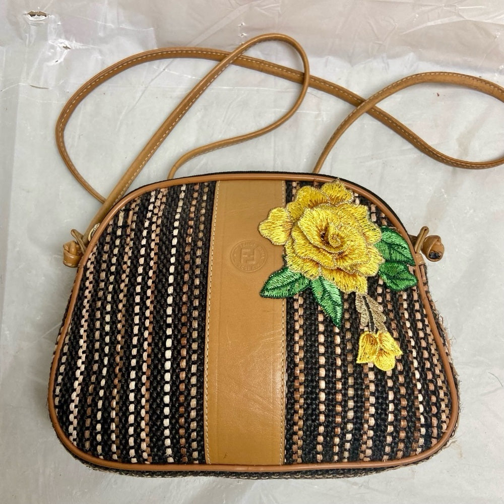 This is a pre-owned Fendi crossbody made of black, white and brown tweed woolen fabric with tan leather trim and strap. It measures 8 inches long and 6.5 inches high and 2 inches wide. It comes with a 52-inch crossbody strap. It has some minimal issues on the exterior and was decorated with floral embellishment. Some scuff issues on bottom corners that resembles missing woven stitches but pretty much sturdy. Overall, it is in good condition with minimal wear as shown in photos. Please supersize photos for condition details.