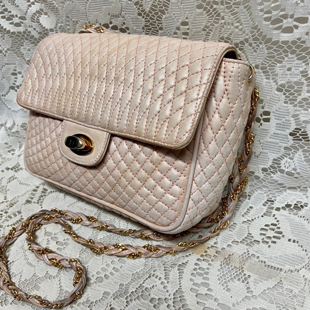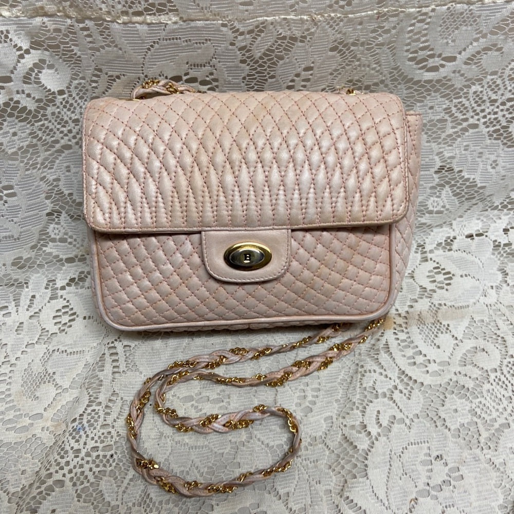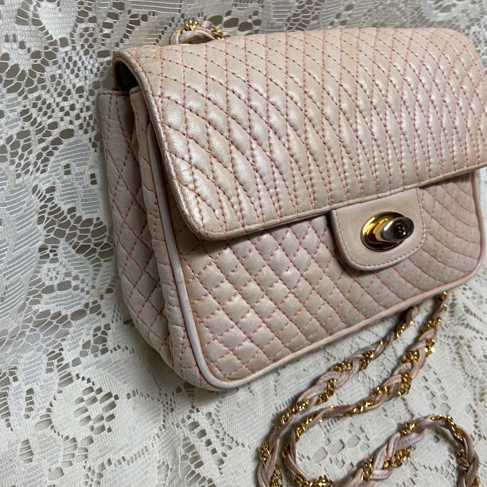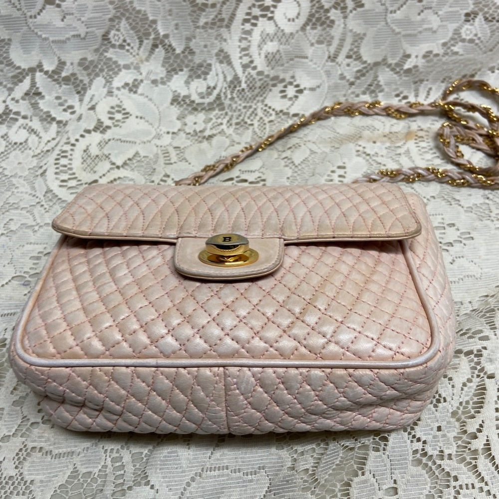 This is a pre-owned, elegant crossbody, made quilted Pink Leather. This will be good enough for your, glasses, cell phone and wallet. It measures about 7 inches long, 6 inches high and 2.5 inches wide and comes with 48-inch interwoven leather and chain crossbody strap. It has soiling, discoloration and fading on the leather exterior but overall it Is in good condition as shown in photos. It is marked: Bally Made in Italy.