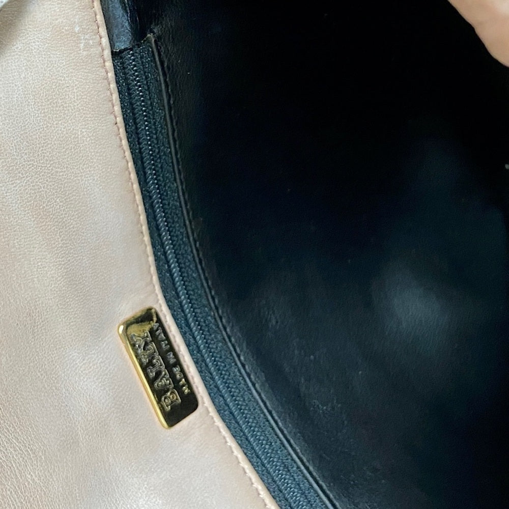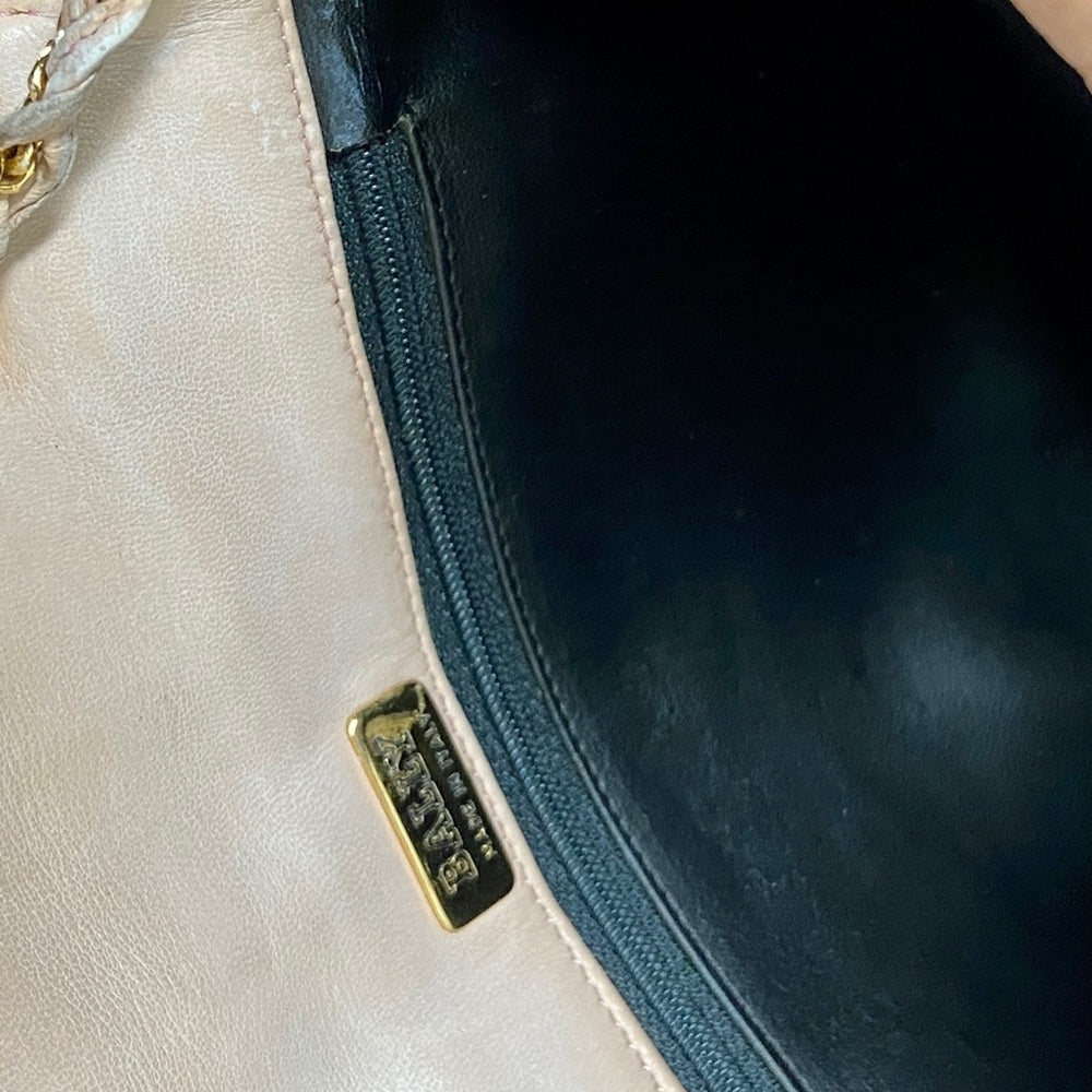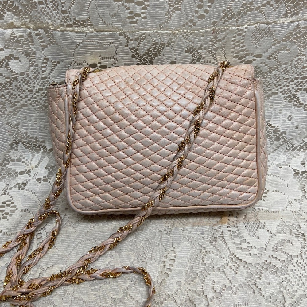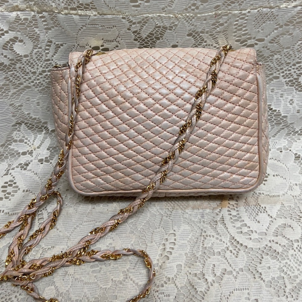 This is a pre-owned, elegant crossbody, made quilted Pink Leather. This will be good enough for your, glasses, cell phone and wallet. It measures about 7 inches long, 6 inches high and 2.5 inches wide and comes with 48-inch interwoven leather and chain crossbody strap. It has soiling, discoloration and fading on the leather exterior but overall it Is in good condition as shown in photos. It is marked: Bally Made in Italy.
