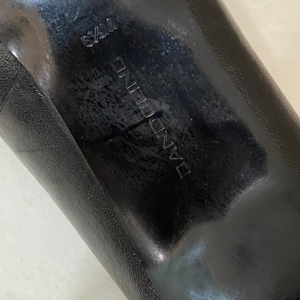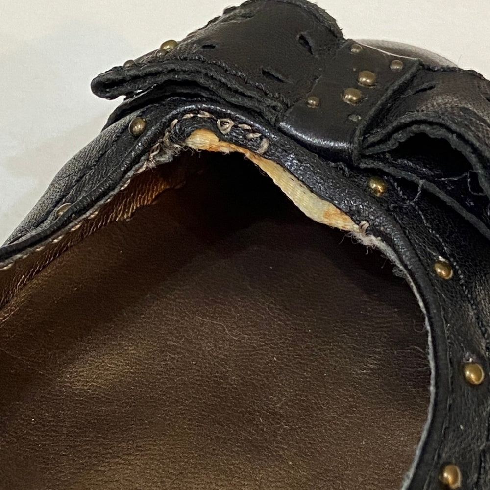 This is a beautiful preowned pair of black leather heels decorated with studs and a bow at the toe. Size 8.5, measures 10.5 inches long, 3.5 inches wide, and 2 inches high. It is in good condition with minimal wear as shown in photos. It is marked Bandolino.