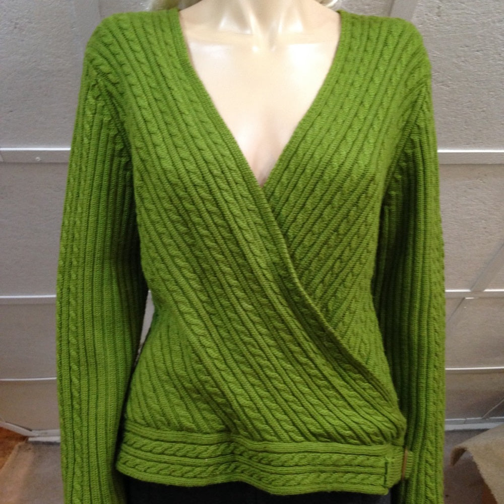 This is a pre-owned stunning Green Sweater made of wool and acrylic. It is in good condition with minimal wear as shown in photos. It has label by Bandolino Size XL but seems to fit better for M-L.. The actual measurements follows: