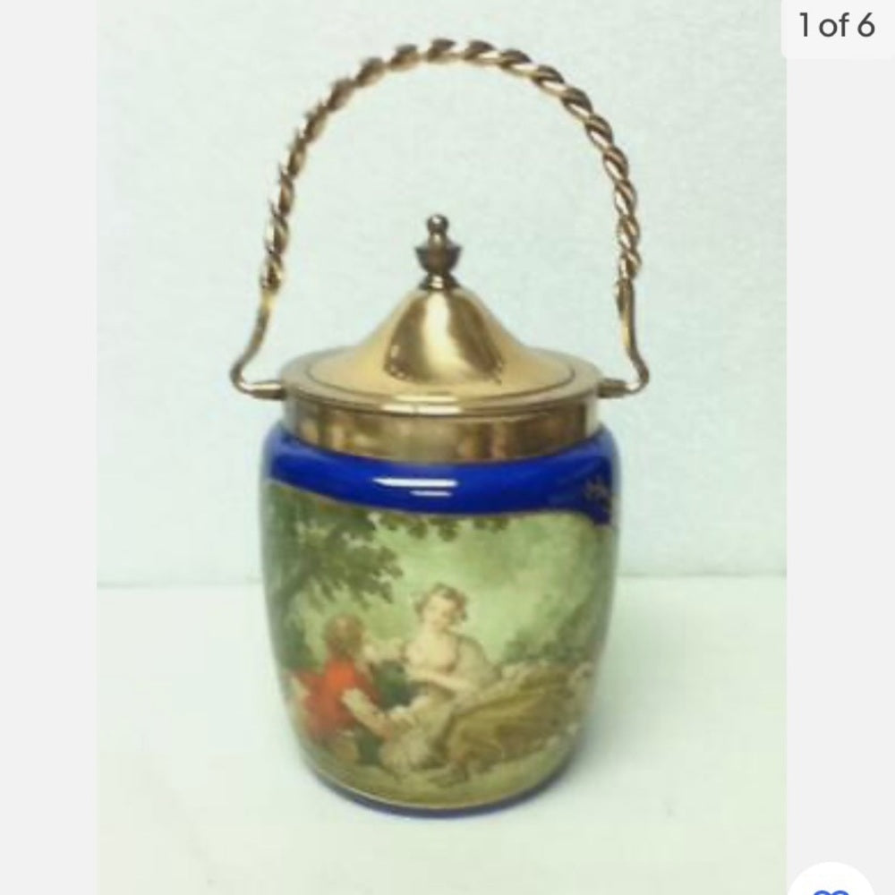 This is a beautiful cracker or biscuit jar, made of ceramic material, probably ironstone, hand painted with a beautiful portrait of a romantic couple and comes with a copper lid and handle. It stands 9 inches high excluding the handle and 5.5 inches in diameter or about 18 inches in circumference. This biscuit jar is in very good condition as shown in photos. It is marked RS Prussia at the bottom, but I'm not sure if this is an original RS Prussia or a reproduction.