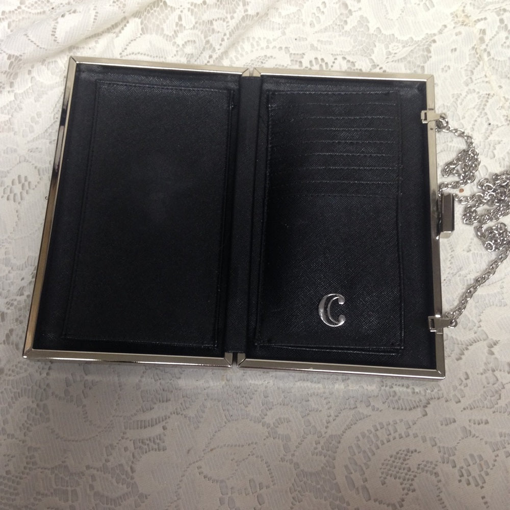 This is a beautiful, evening Purse made of Boxy silver tone metal with faux leather exterior. It measures 5 inches high, 8 inches long and 1.5 inches wide. It has slots for ID and Credit cards. It comes with a 48-inch silver chain. it has a makers marking "C"