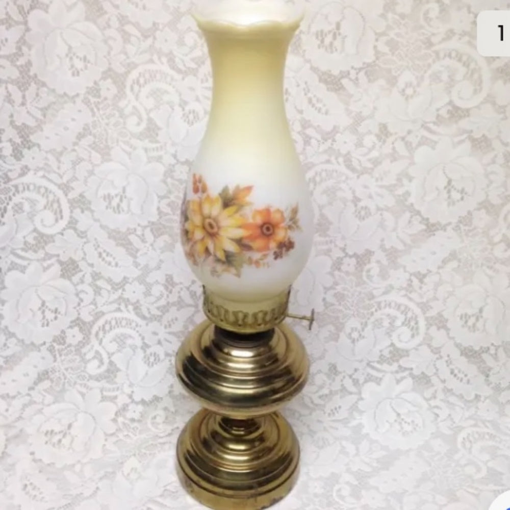 This is a beautiful kerosened lamp, made of brass with milk glass floral chimney. Together the lamp measures 18 inches high; the base or stand is about 9 inches tall and the milk glass floral chimney measures 10 inches high. The lamp is in good vintage condition as shown in photos. No makers mark found.. Package weight is about 5 lbs.