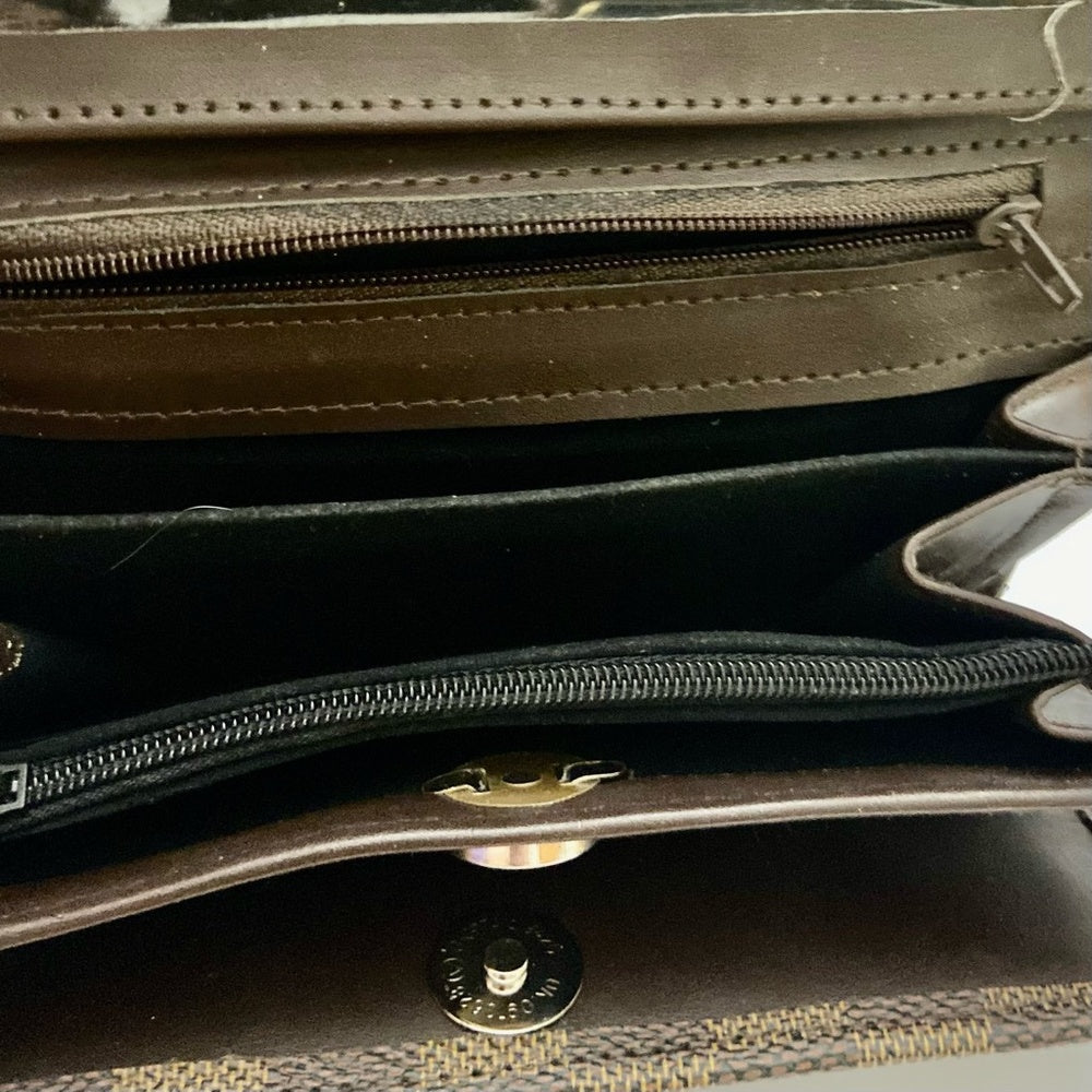 This is a beautiful brown and tan plaid faux leather organizer, long wallet and it measures 7 inches long, 4 inches wide and 1.5 inches thick. It is new without tag as shown in photos. Please supersize for condition details.