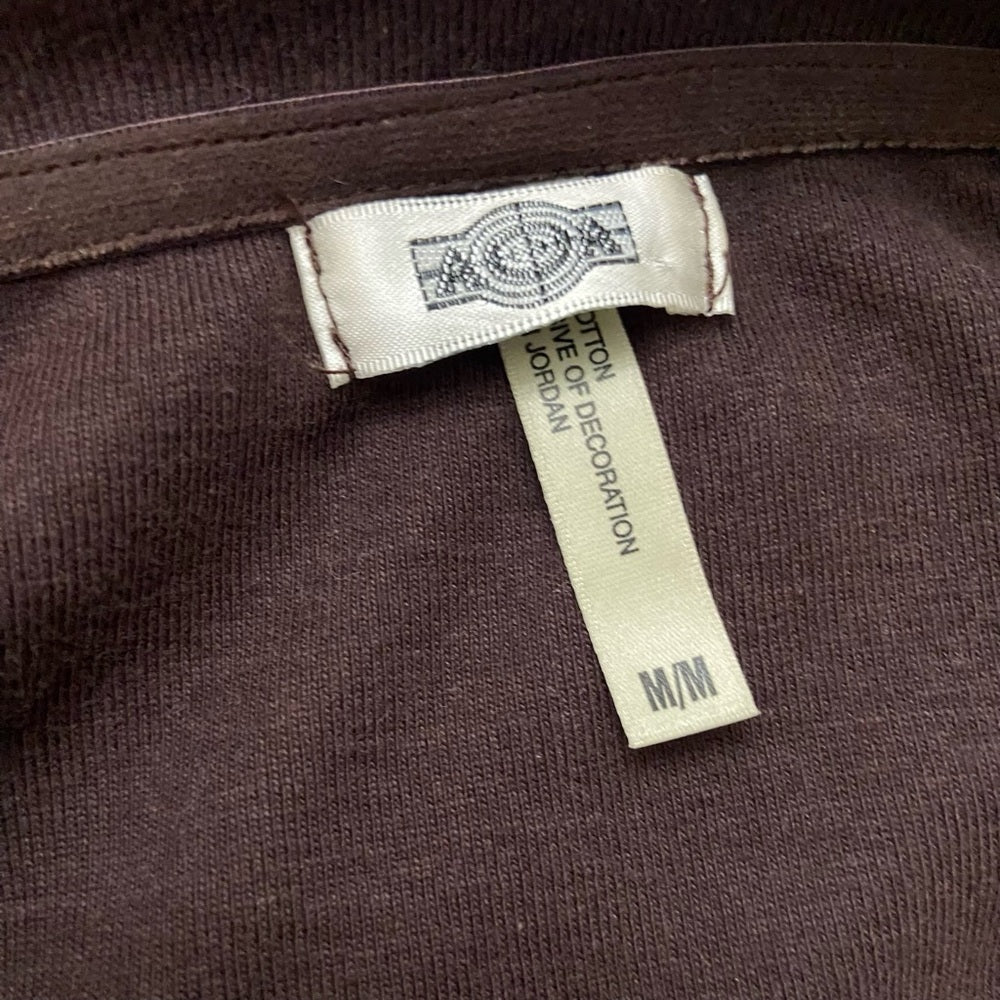 This is a beautiful, brown pullover blouse with beige lace neckline. It is in good condition as shown in photos. This will fit size:L. Actual measurements to follow: