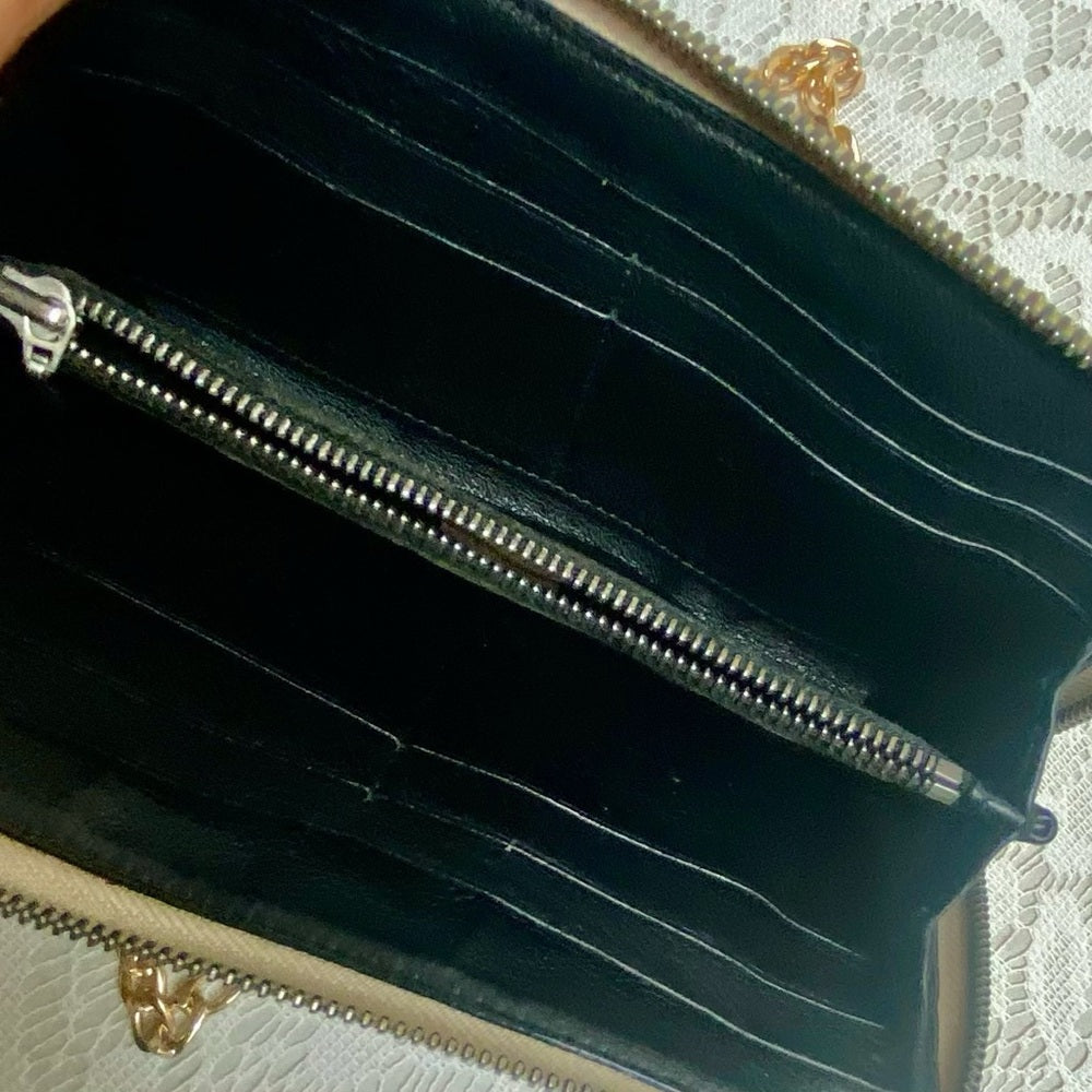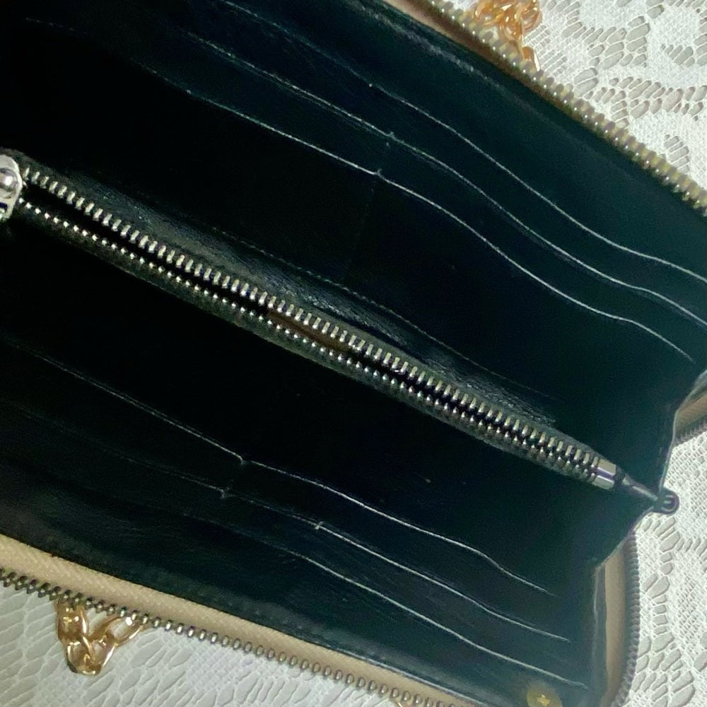 This is a beautiful , pre-owned zip around long wallet made beige Mono Canvas, converted into a crossbody by adding a 50-inch gold chain. This wallet has a slots for bills, IDs and Credit cards and zip pocket for coins and keys. Folded it measures about 7.5 inches long and 4 inches wide. It has replaced zipper pull, soiling and discoloration as shown in photos. Please supersize photos for condition details.